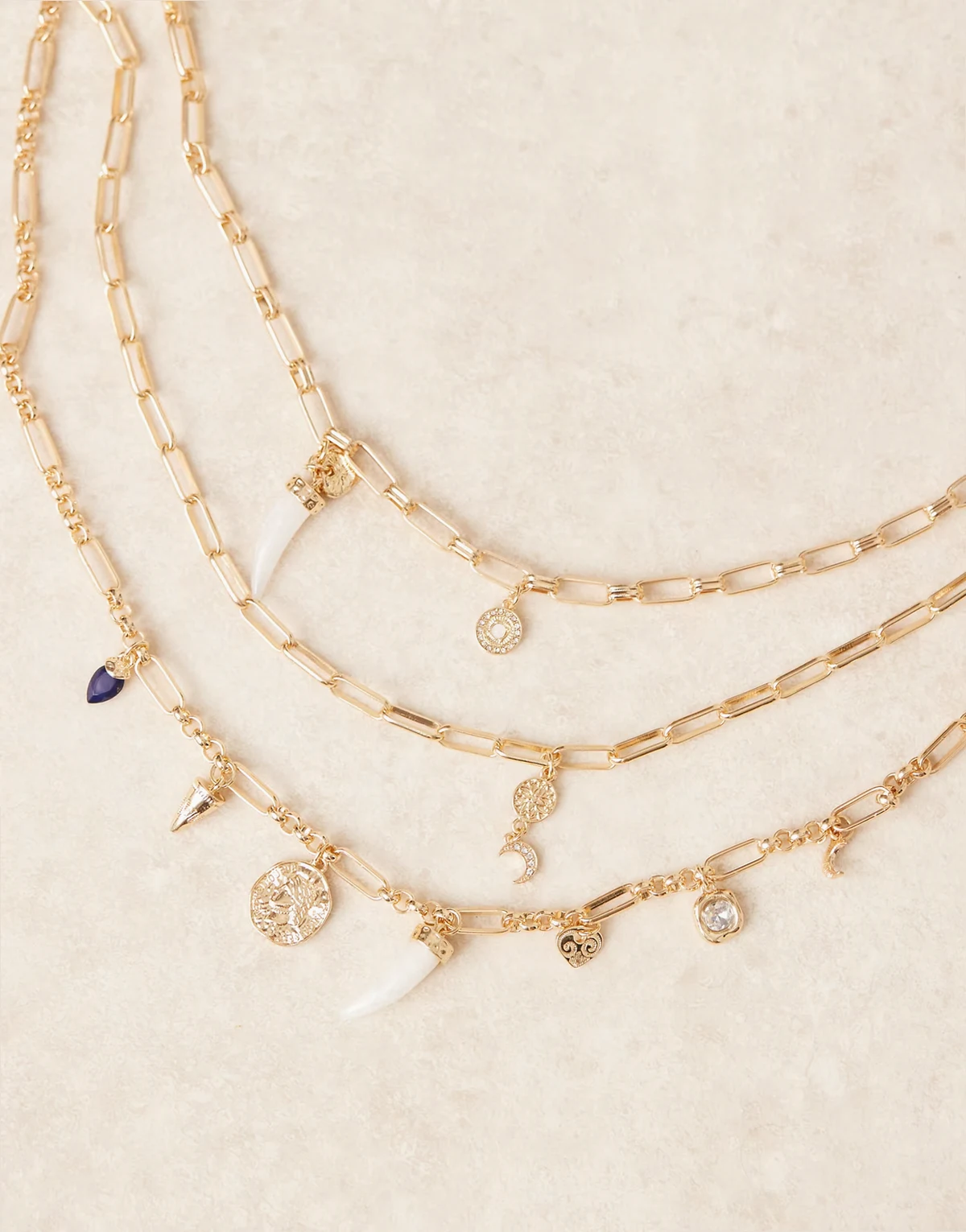 – Mehrreihige Halskette in Goldoptik mit Anhängern