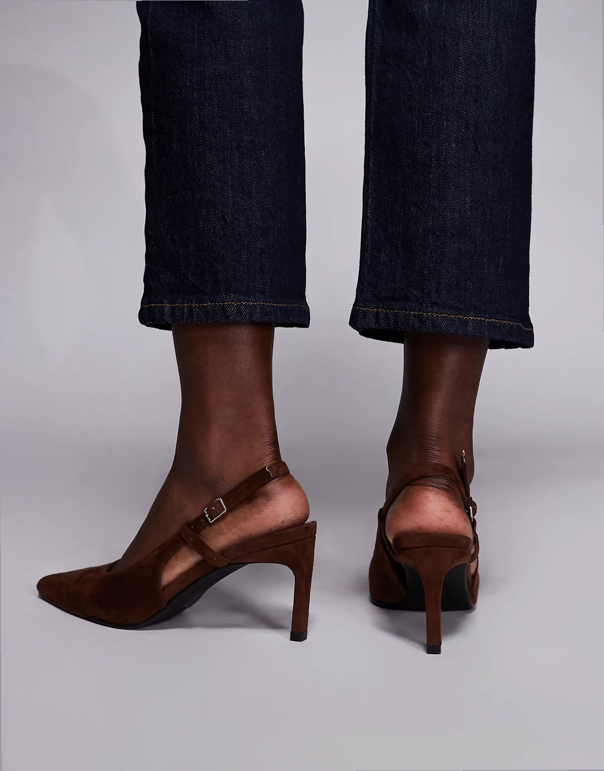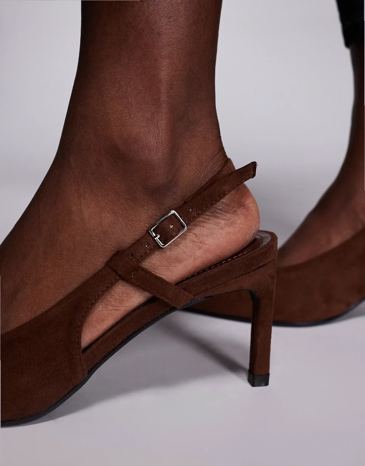 – Schuhe aus Wildlederimitat in Braun mit Fersenriemchen und Kitten-Absatz