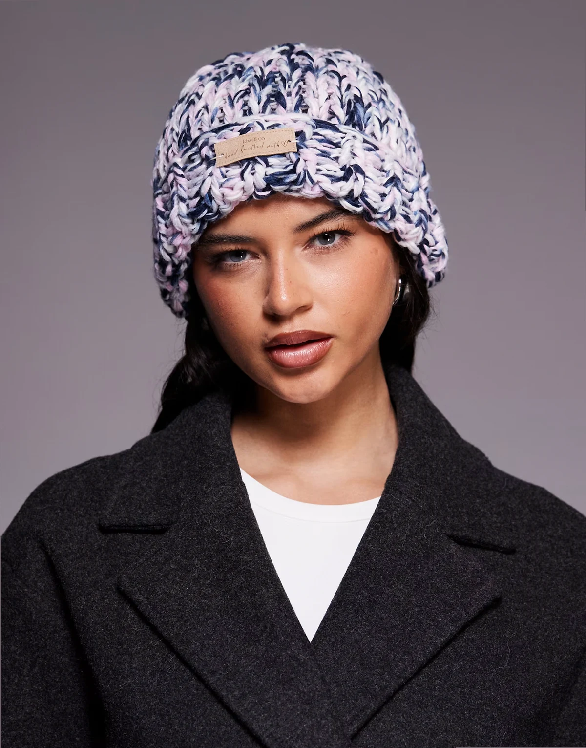 – Love Note – Handgestrickte Grobstrickmütze in meliertem Flieder