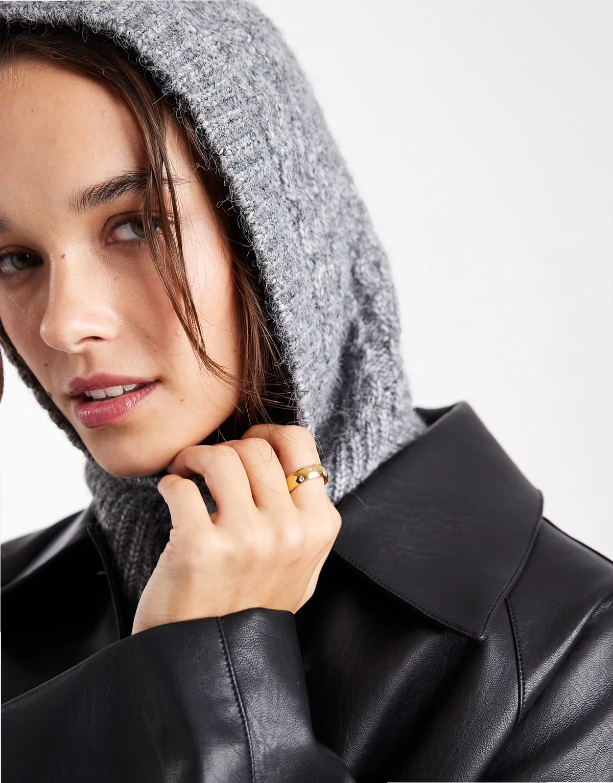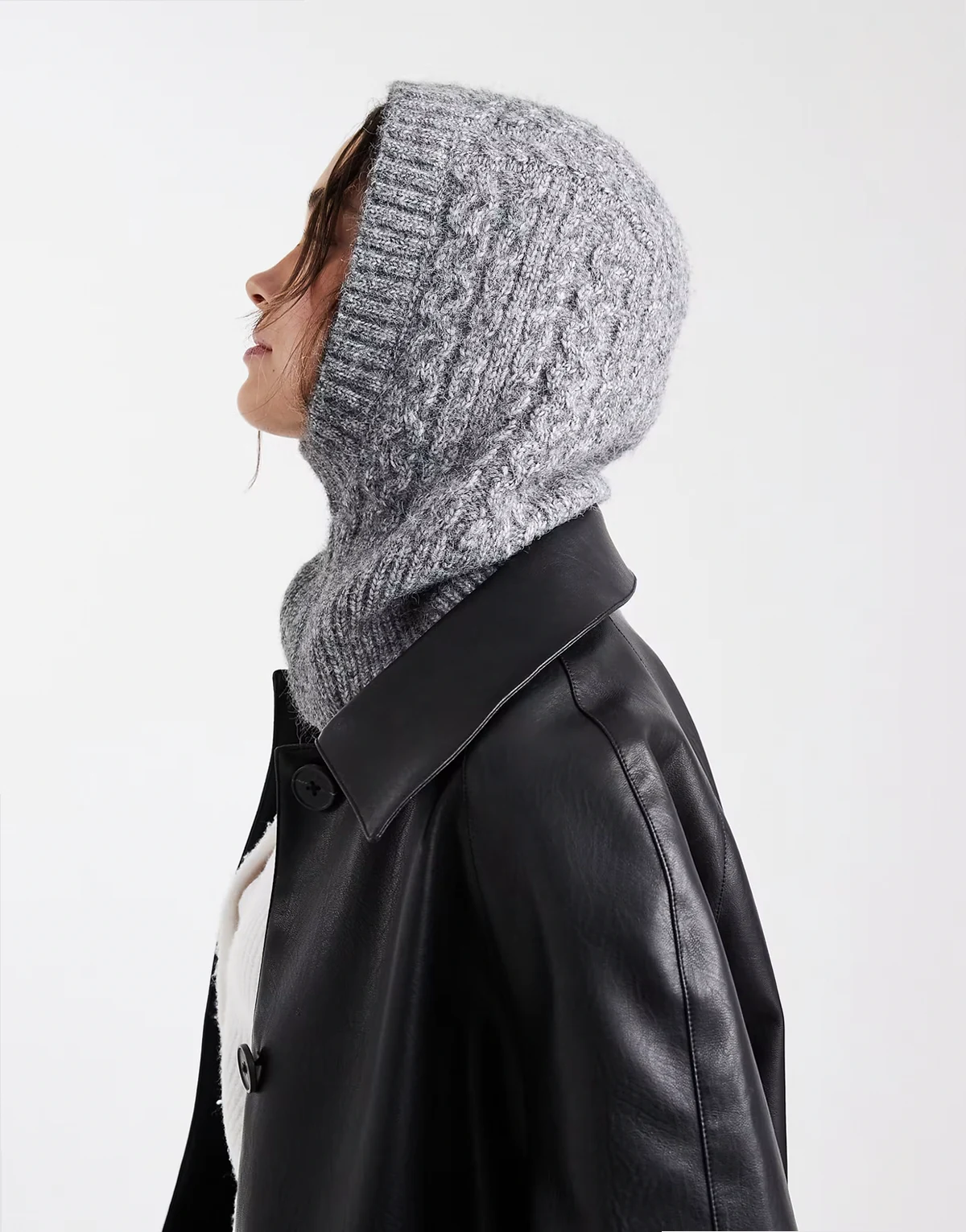 – Balaclava aus Strick in meliertem Dunkelgrau mit Zopfmuster
