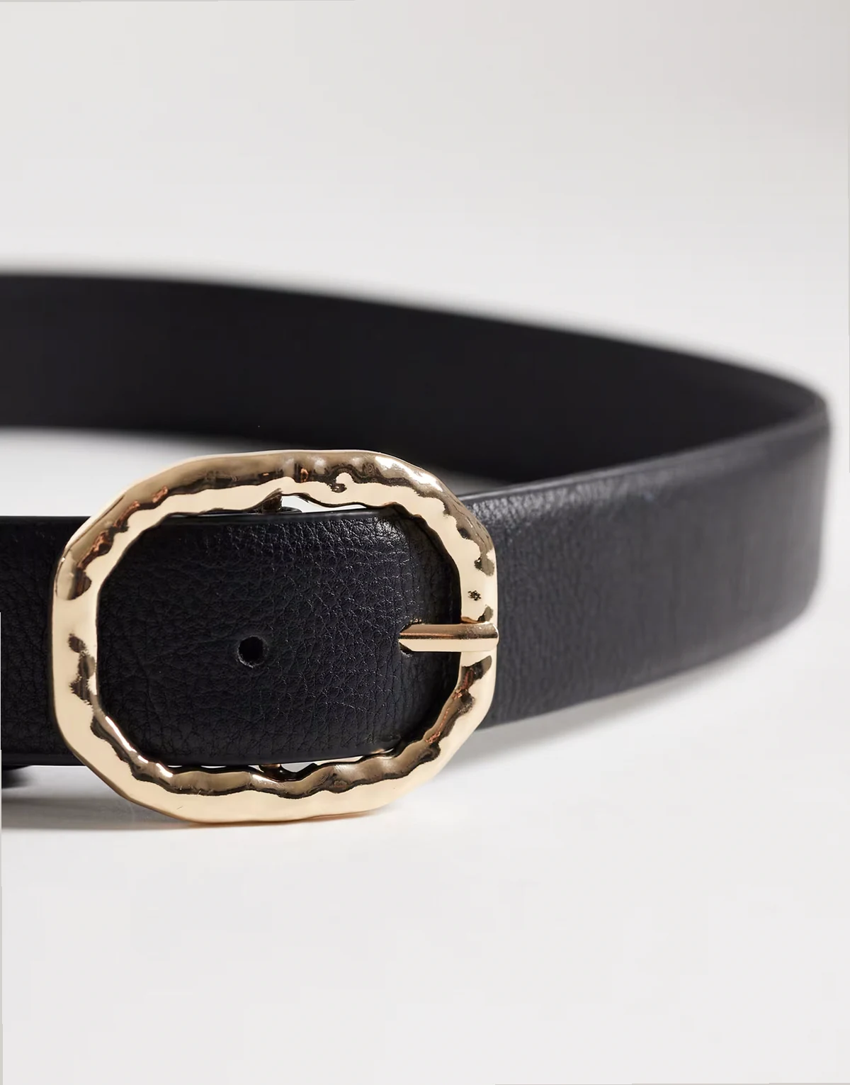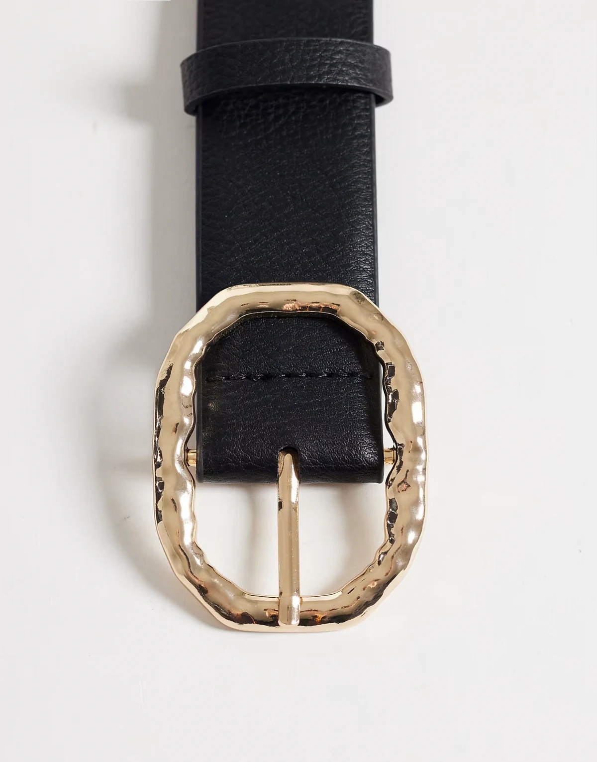 – Gürtel aus Kunstleder in Schwarz mit gehämmerter, goldfarbener Metallschnalle
