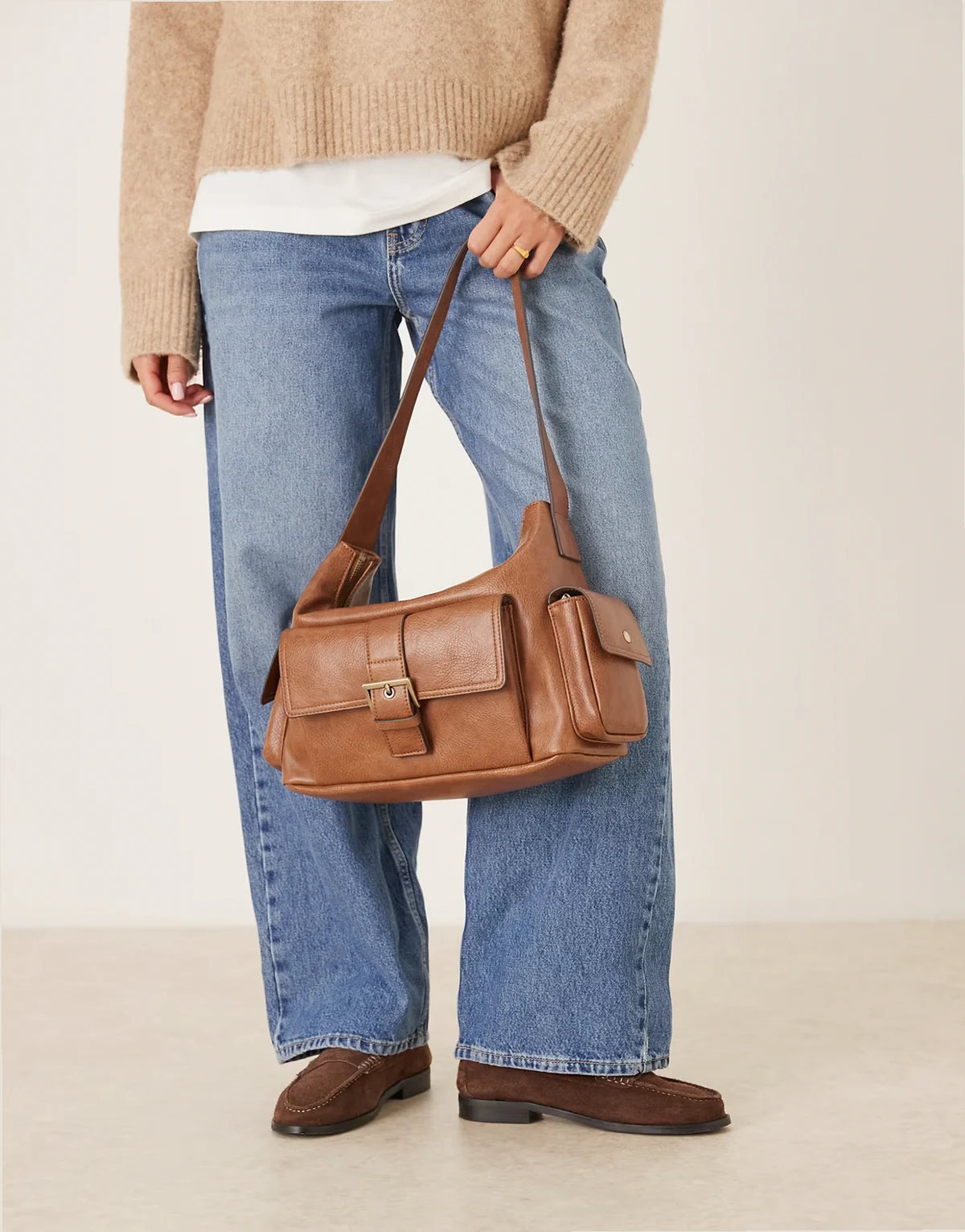 – Schultertasche aus Wildlederimitat in Hellbraun mit Doppelriemen