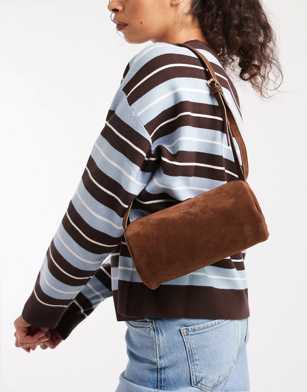 – Schultertasche aus Wildlederimitat in Hellbraun mit Doppelriemen