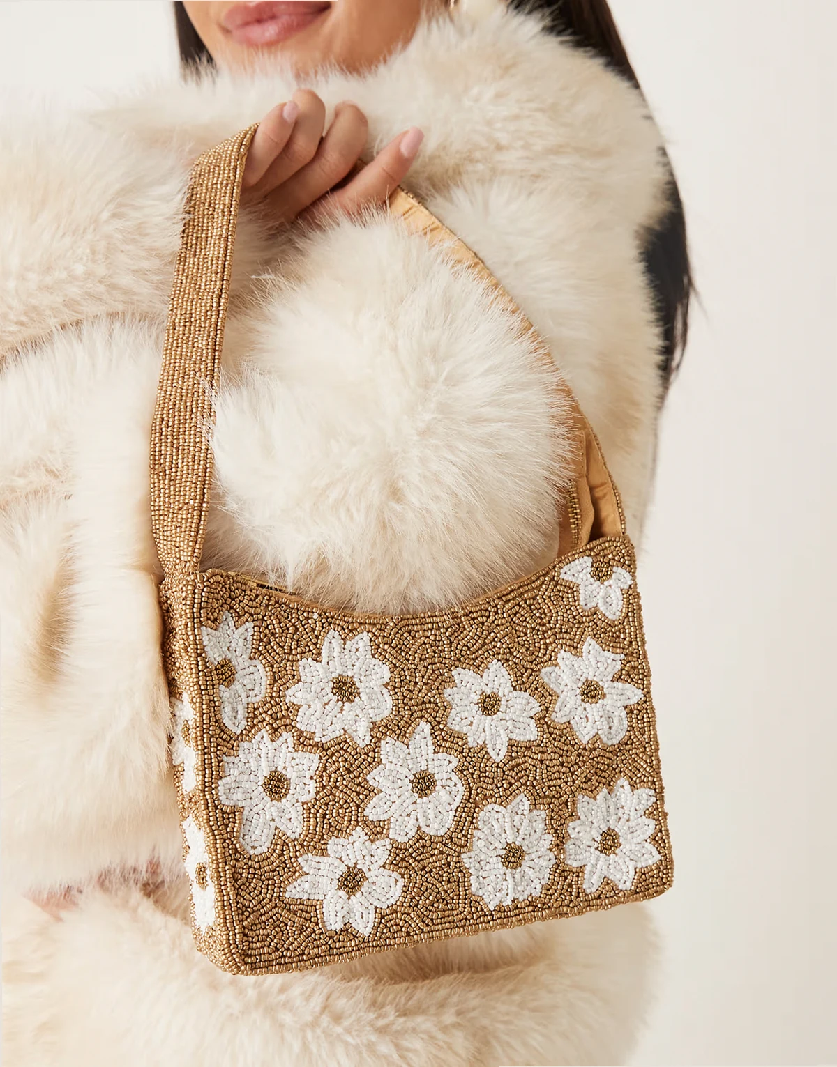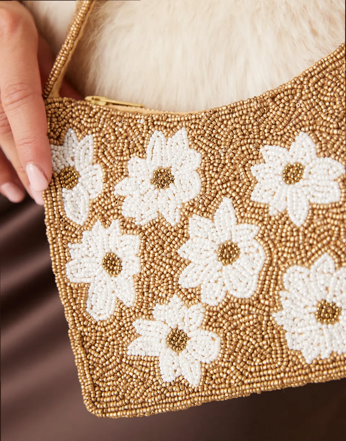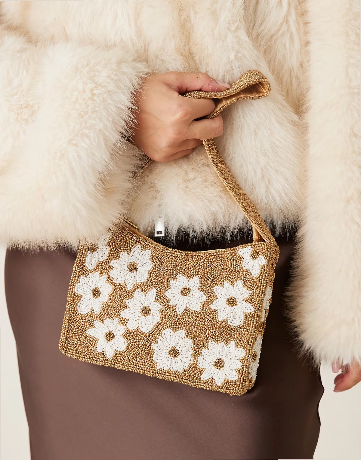 – Perlenbesetzte Schultertasche in Gold mit Blumendetails
