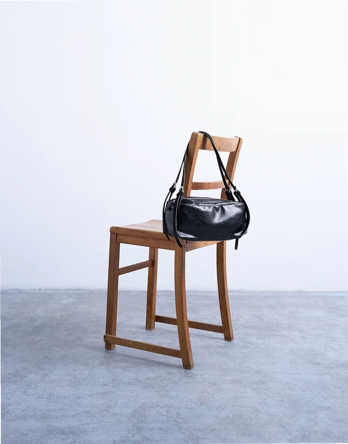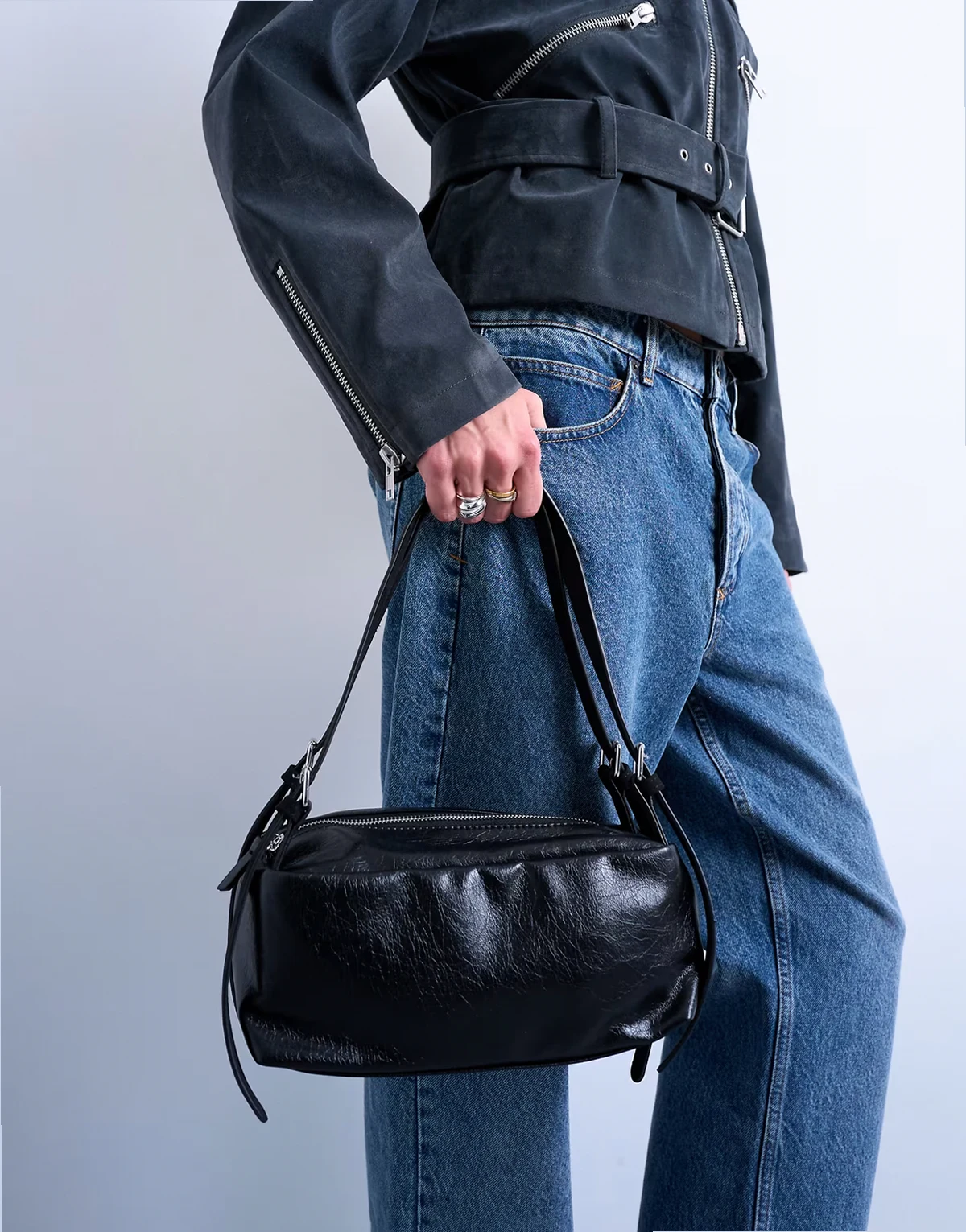 Die Schultertasche Siris ist aus einem leicht strukturierten Material gefertigt. Sie ist in einem zeitlosen Schwarzton gehalten und verfügt über verstellbare Schulterriemen, einen Reißverschluss und silberfarbene Metalldetails.