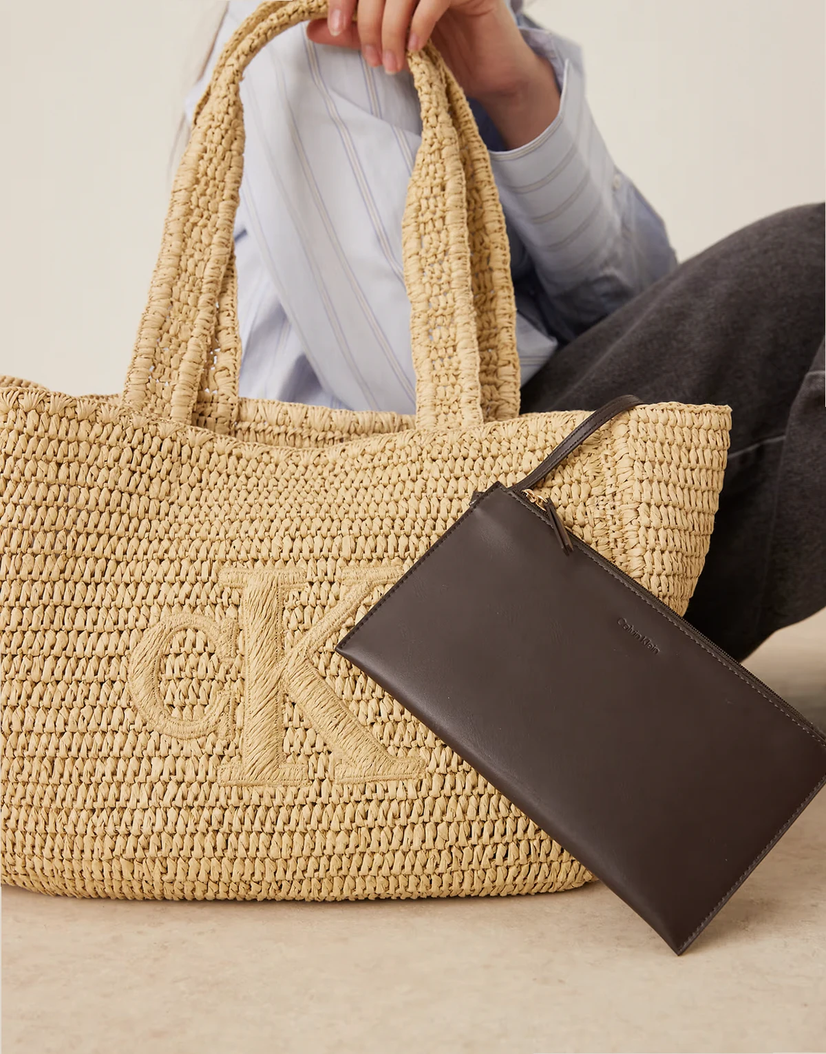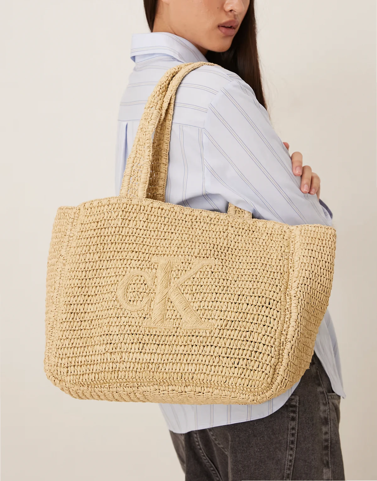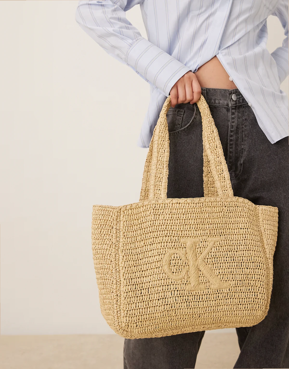 Jeans – Mittelgroße Bast-Tragetasche in Natur mit Logo