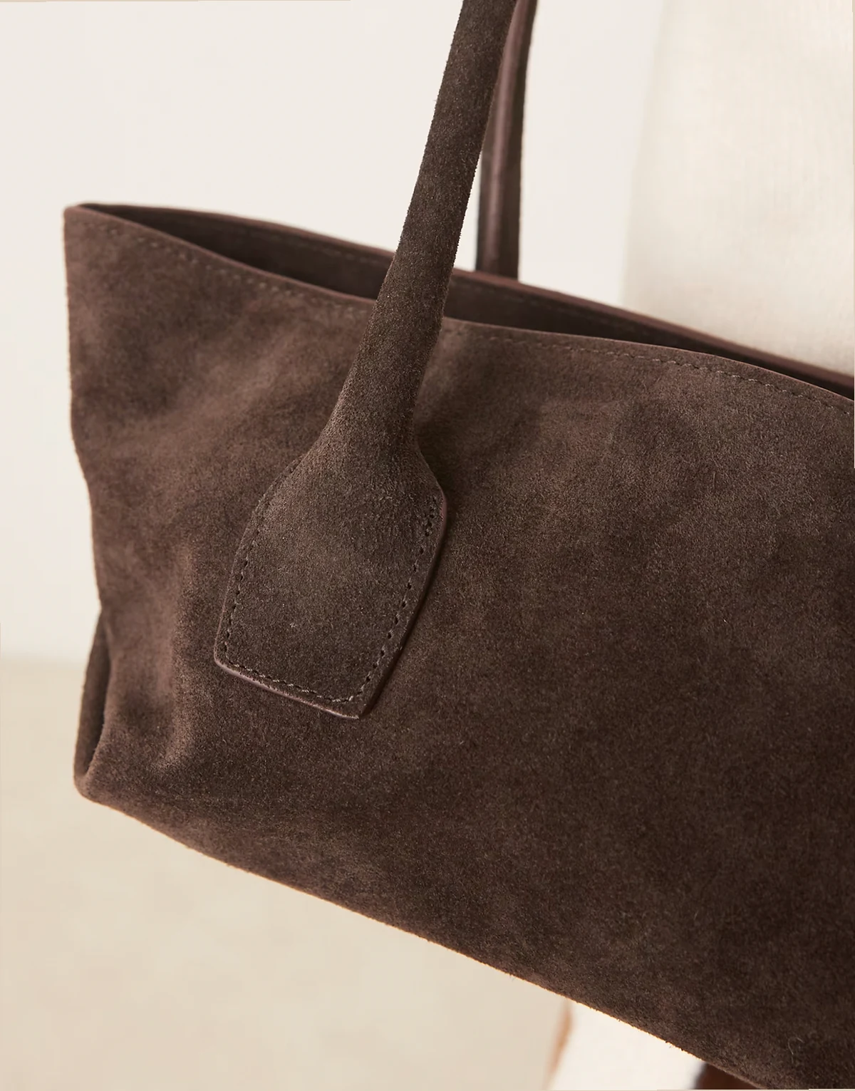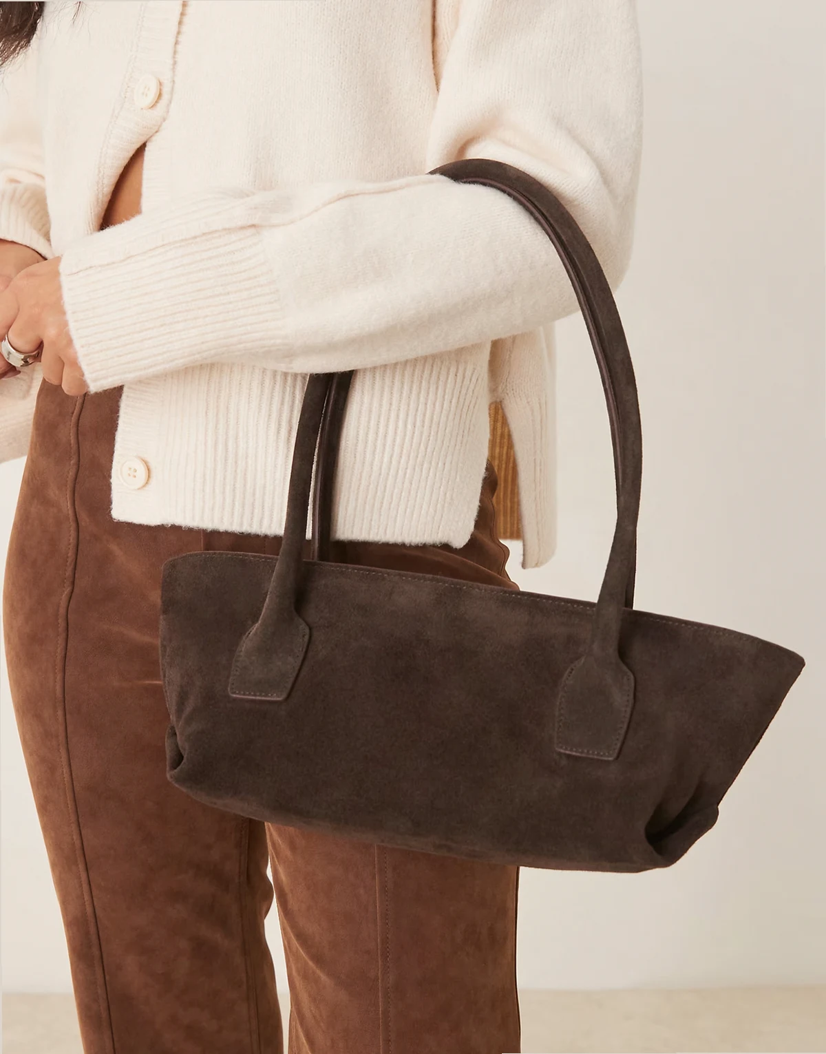 – Längliche Handtasche aus Wildleder in Schokobraun