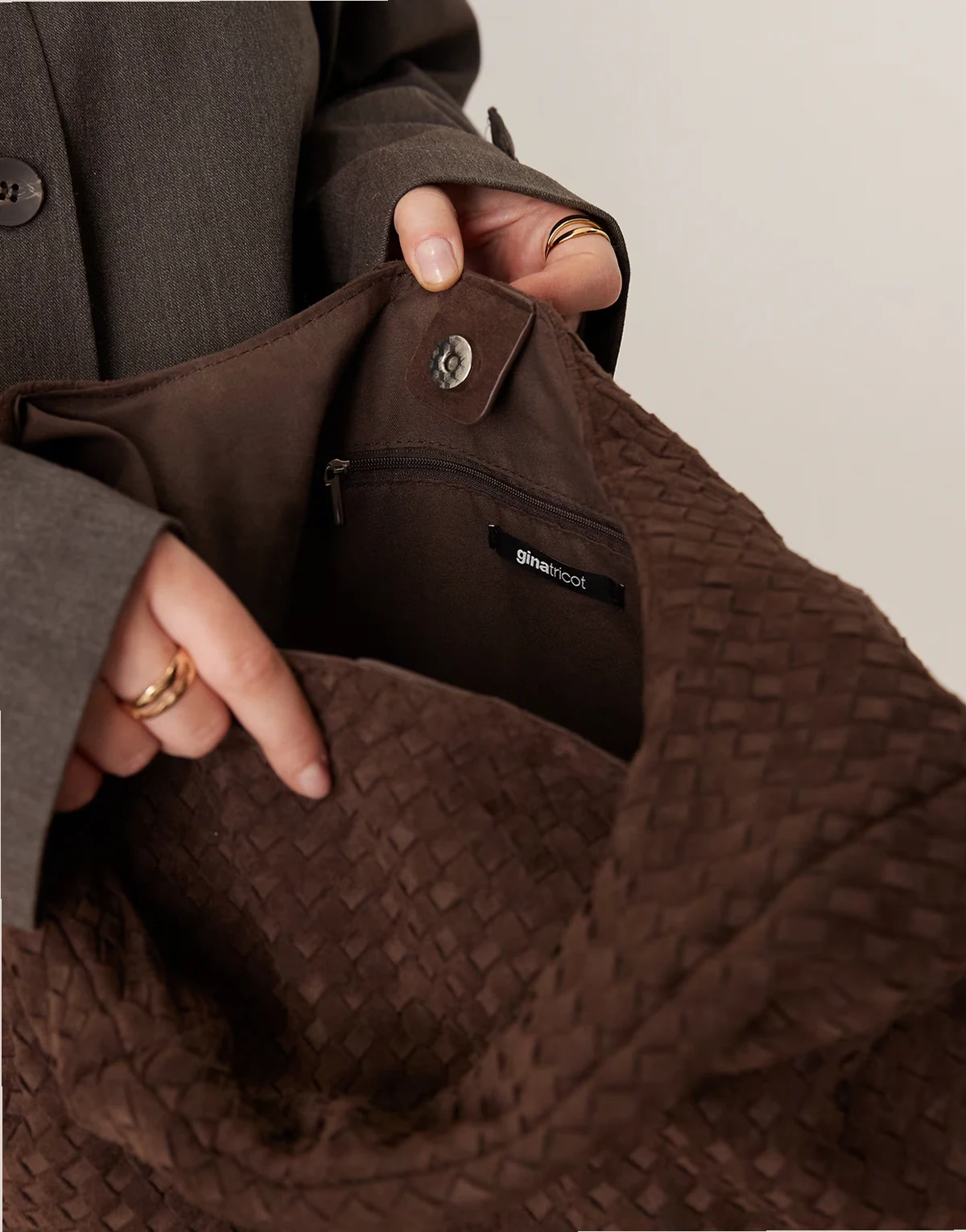 – Große Schultertasche aus Wildlederimitat in Dunkelbraun mit Flechtdesign