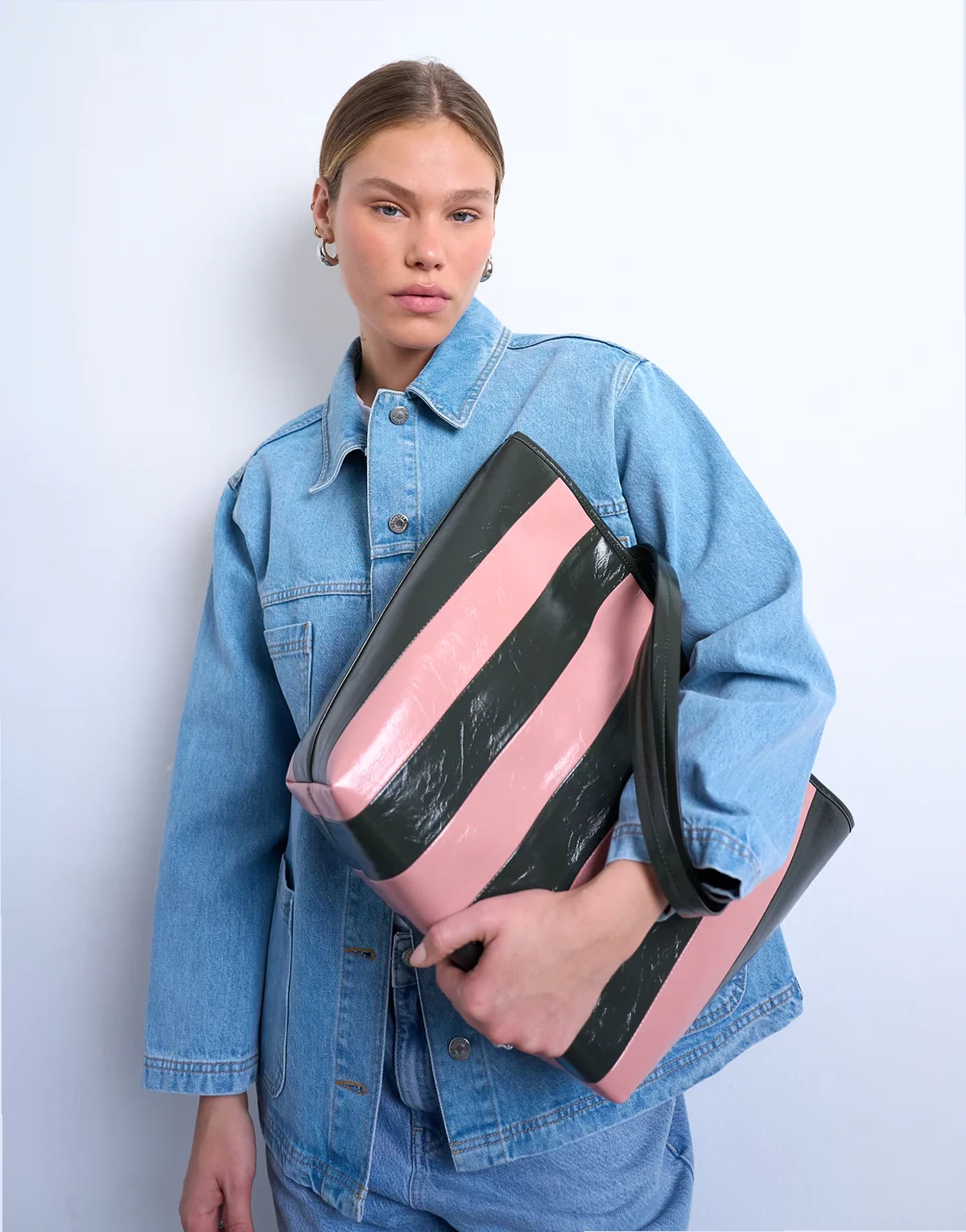 Die Stevie Tasche ist mit einem glänzenden Streifenmuster und zwei Schulterriemen versehen. Die Tasche hat ein geräumiges Hauptfach, in dem du deine wichtigsten Sachen unterbringen kannst.
