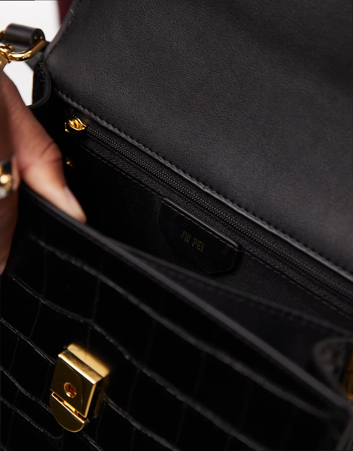– Kleine Umhängetasche in Kroko-Schwarz mit Umschlag