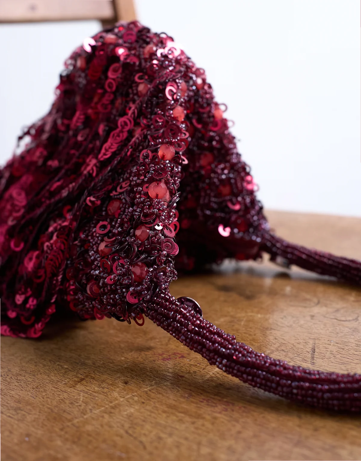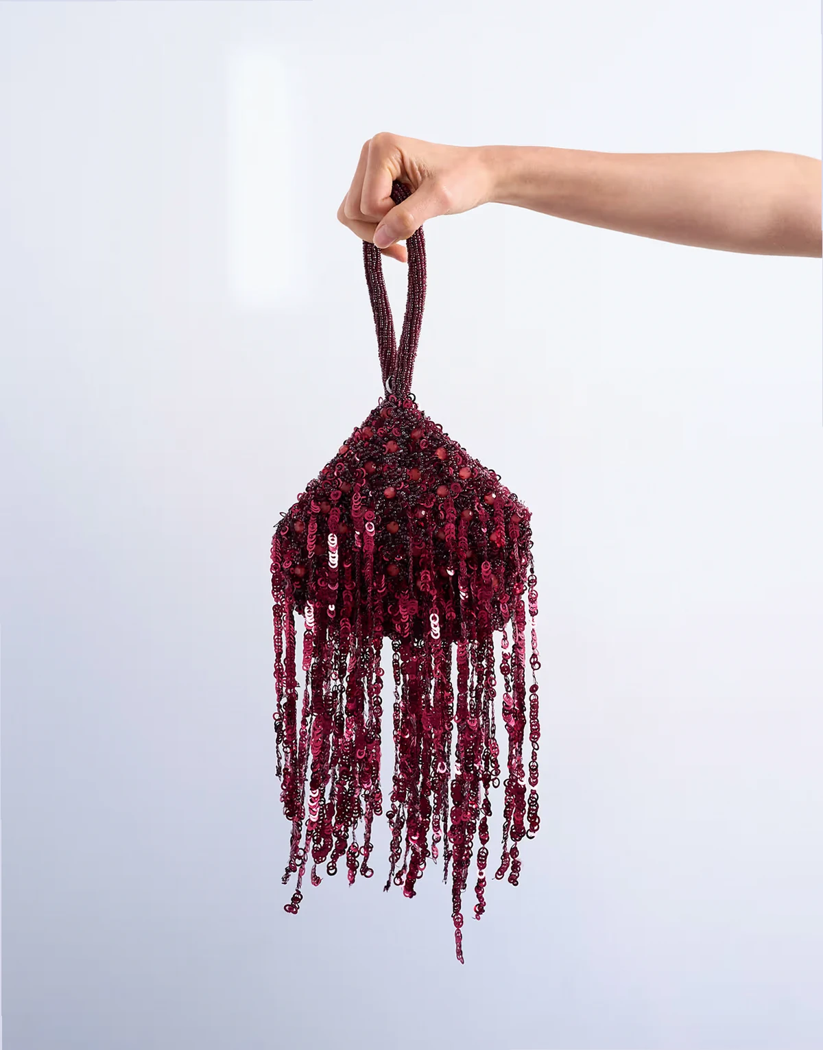 Die Giana Tasche ist durchgehend mit Pailletten verziert. Das Modell verfügt über einen Tragegriff, einen sicheren Verschluss und Fransenverzierungen.