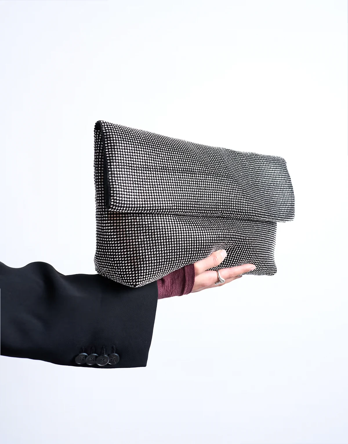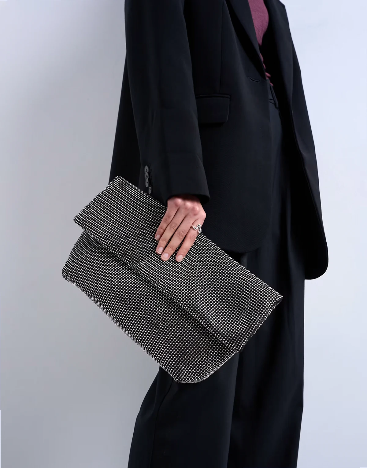 Die Clutch Georgia ist aus gewebtem Material gefertigt und mit Strass verziert. Dieses Modell im Oversize-Design wird durch eine Umschlag an der Oberseite abgerundet.