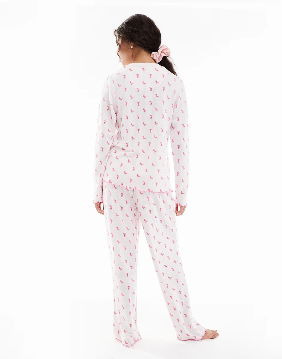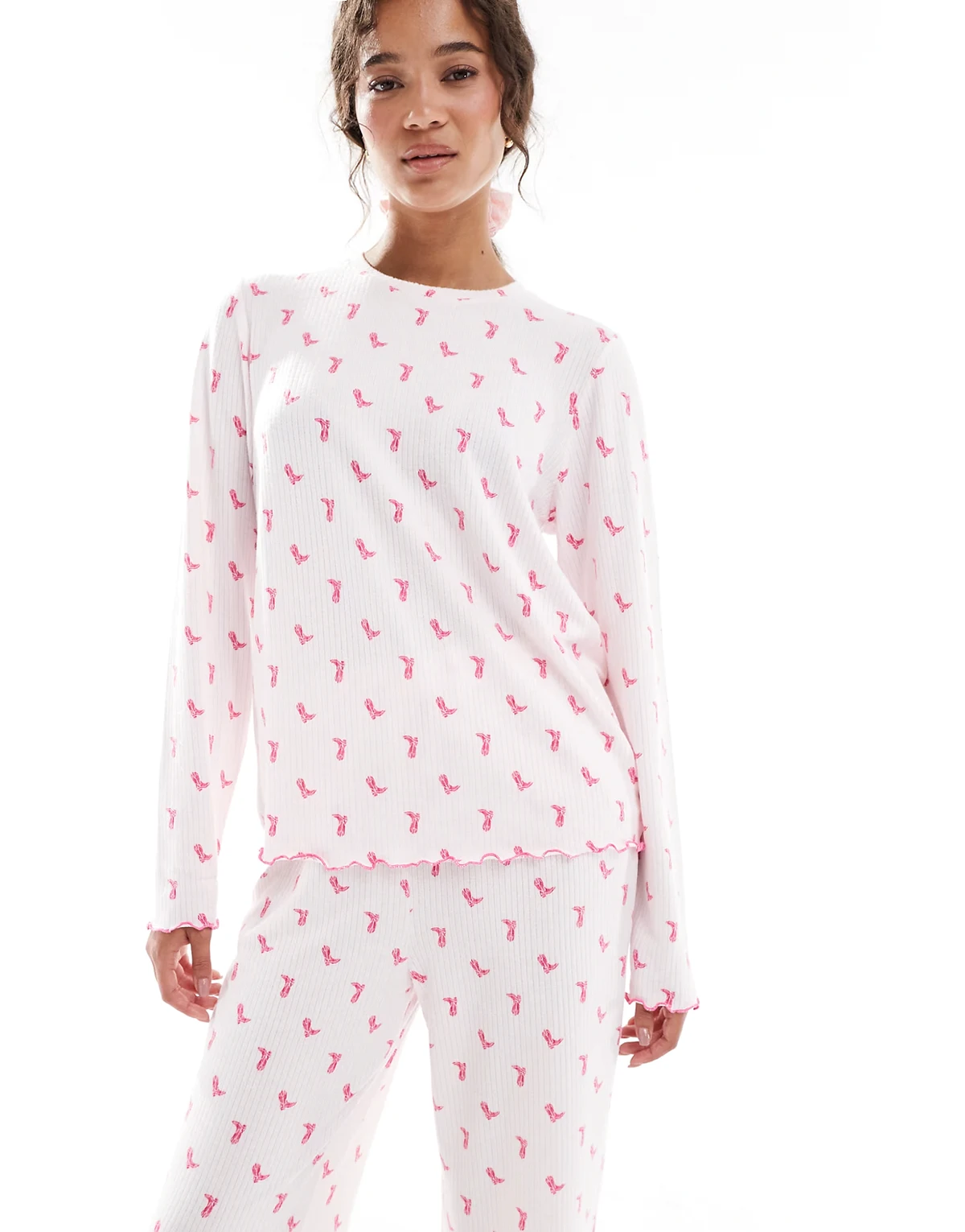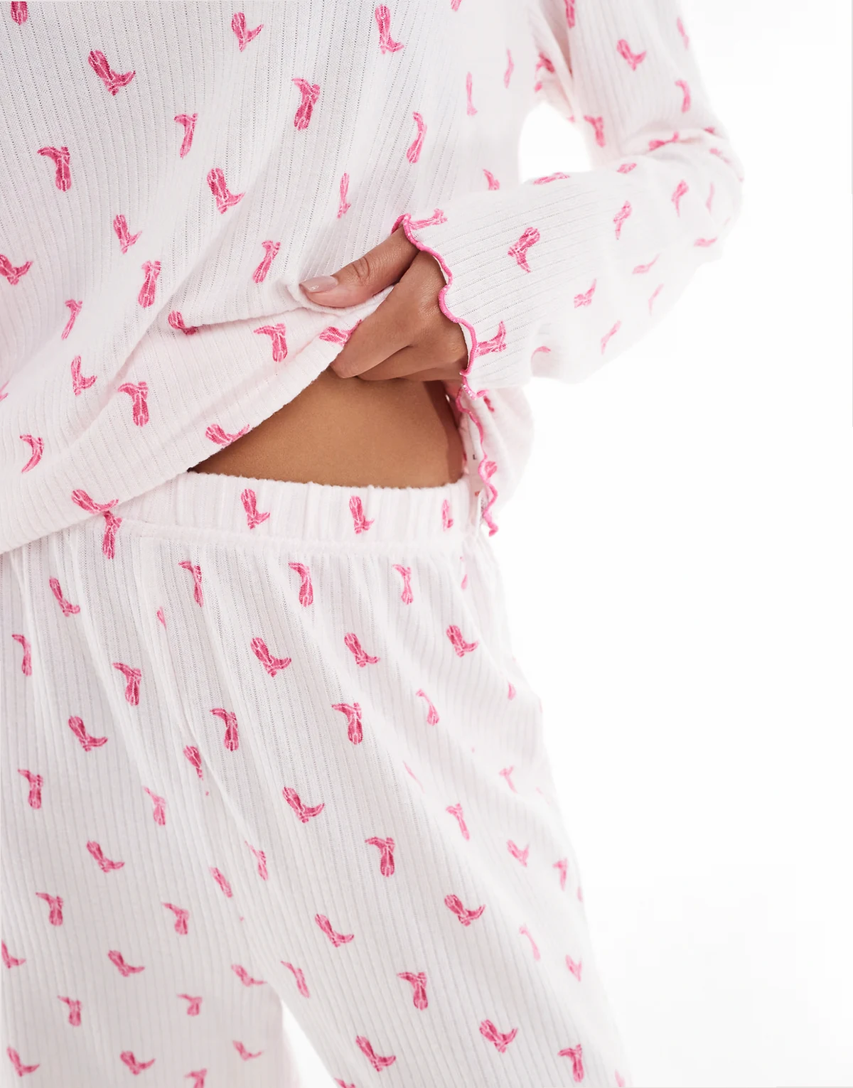 – Geripptes, angerautes Set in Rosa mit Cowboystiefel-Muster, bestehend aus langärmligem Oberteil und Hose