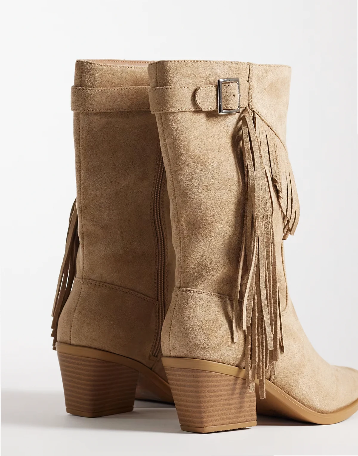 – Kniehohe Westernstiefel in Sand mit Schnalle und Fransen