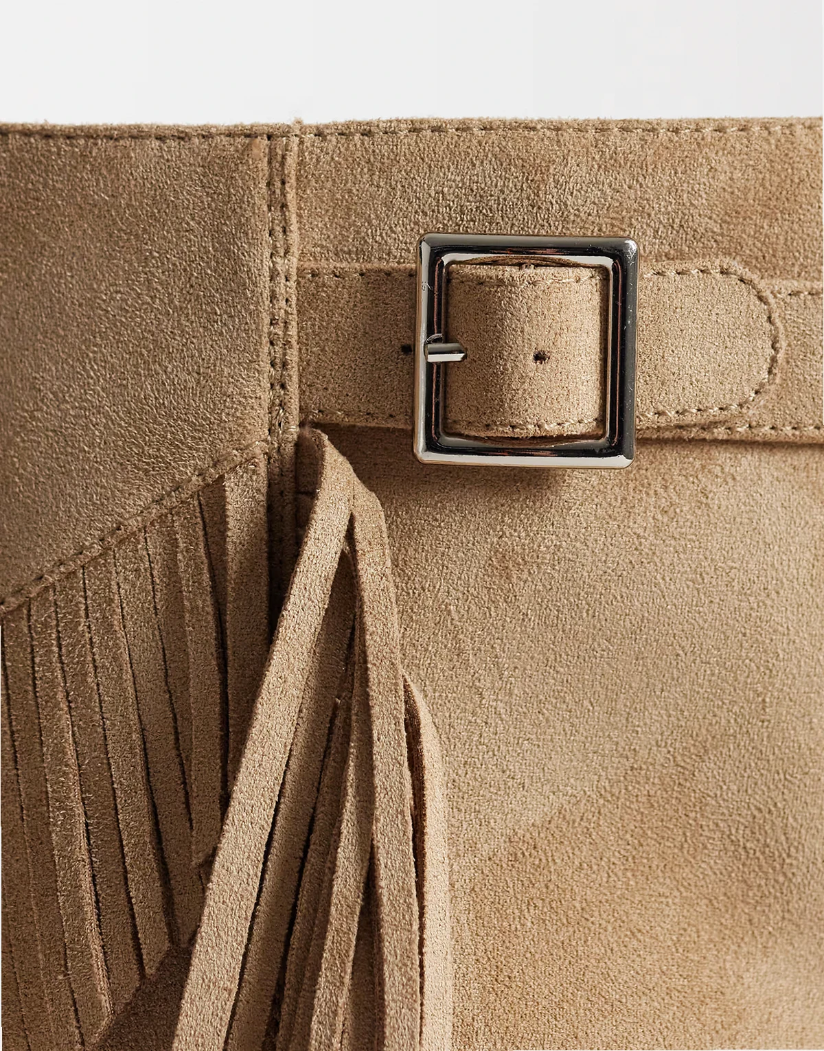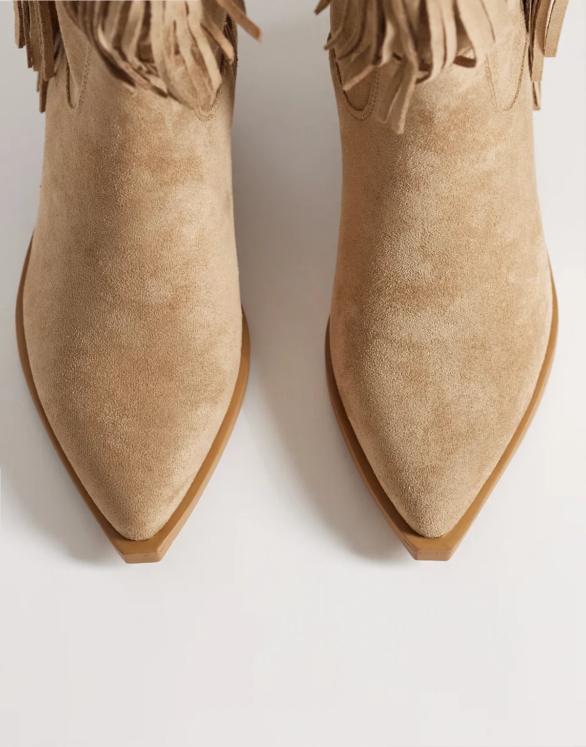 4. – Kniehohe Westernstiefel in Sand mit Schnalle und Fransen