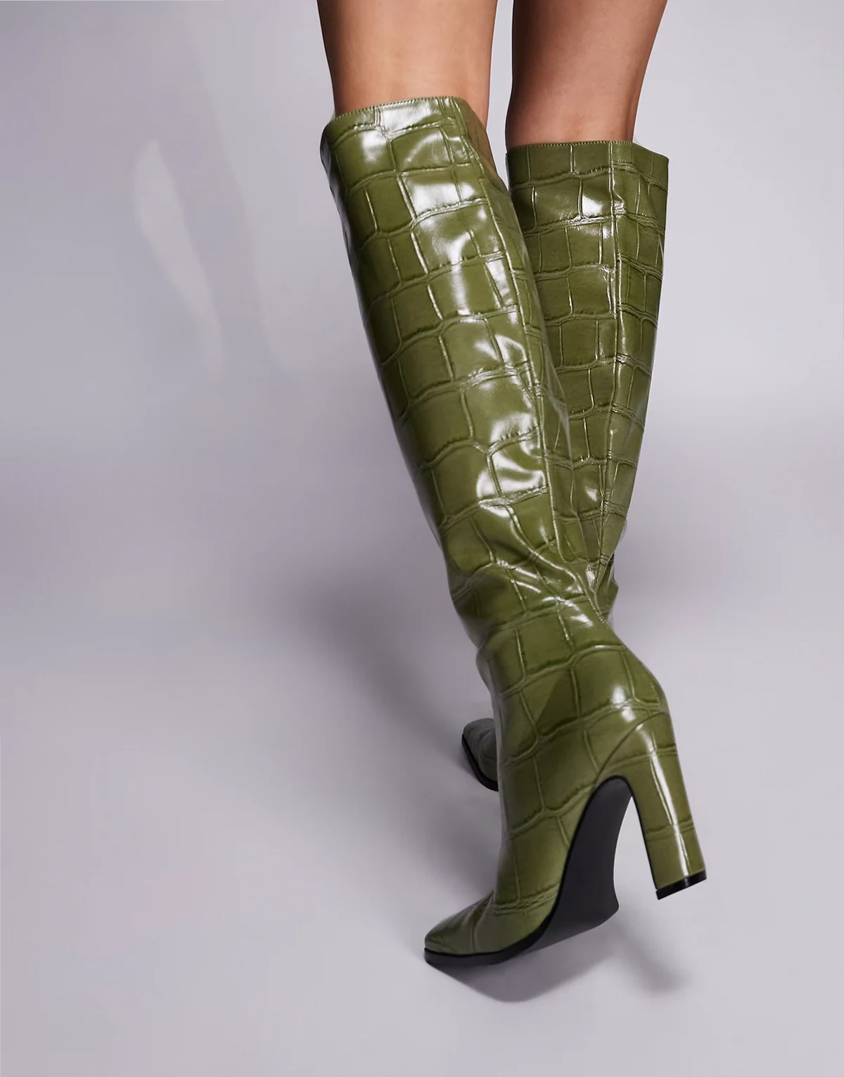 4. – Libre – Kniehohe Stiefel in breitem Kroko-Grün mit Absatz