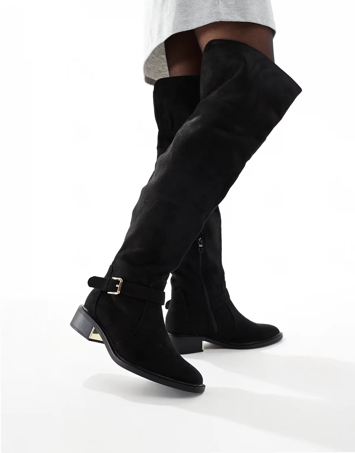SEQWL – Wide Fit – Latte – Overknee-Stiefel in Schwarz mit Schnalle, weite Passform