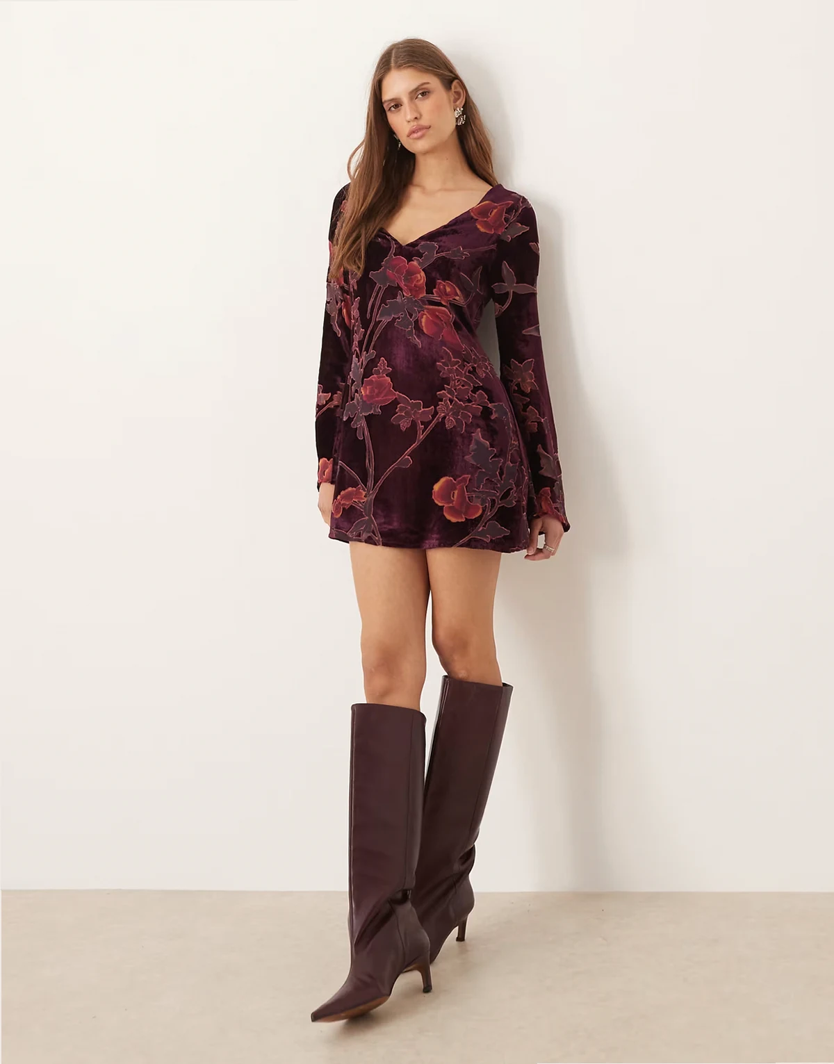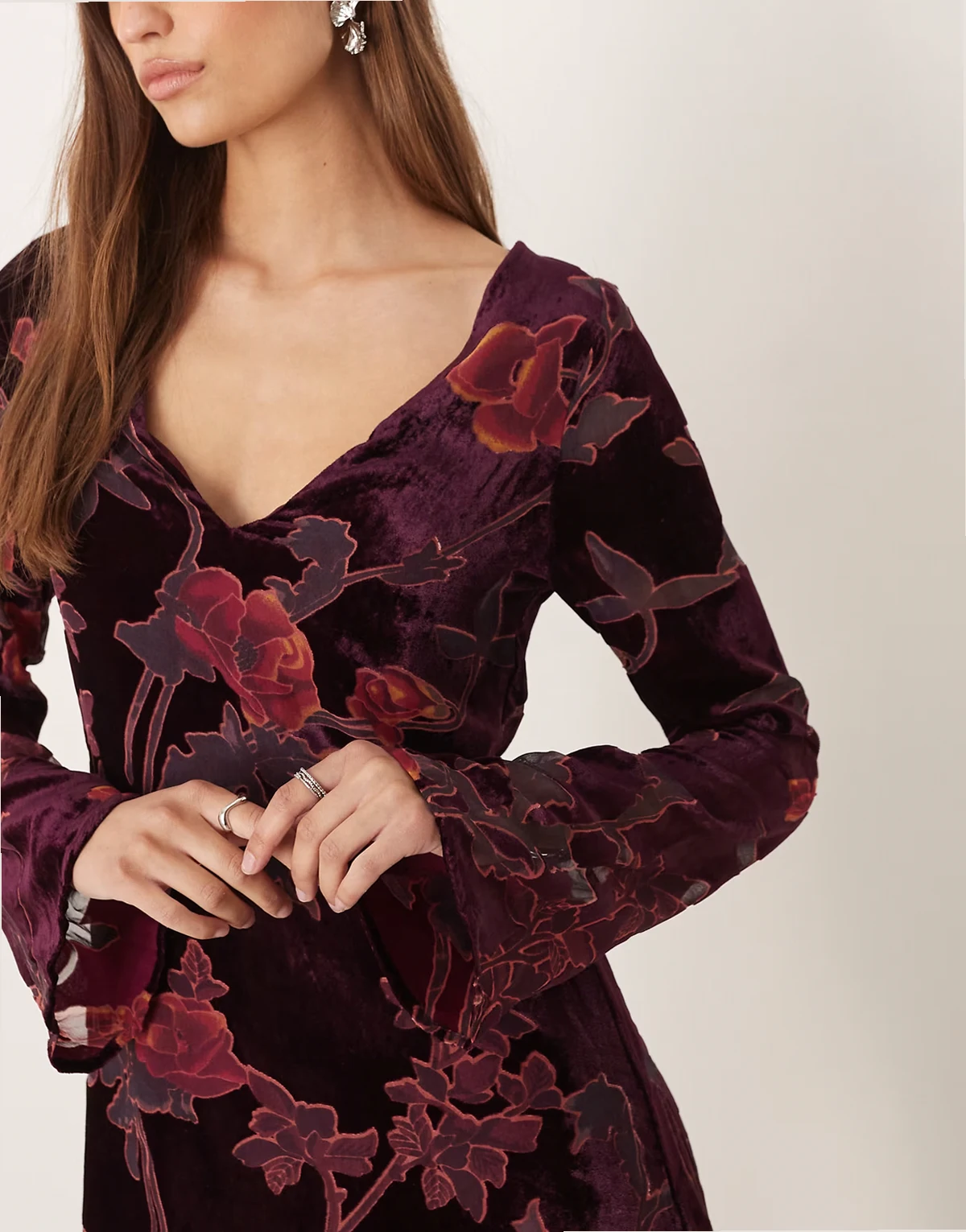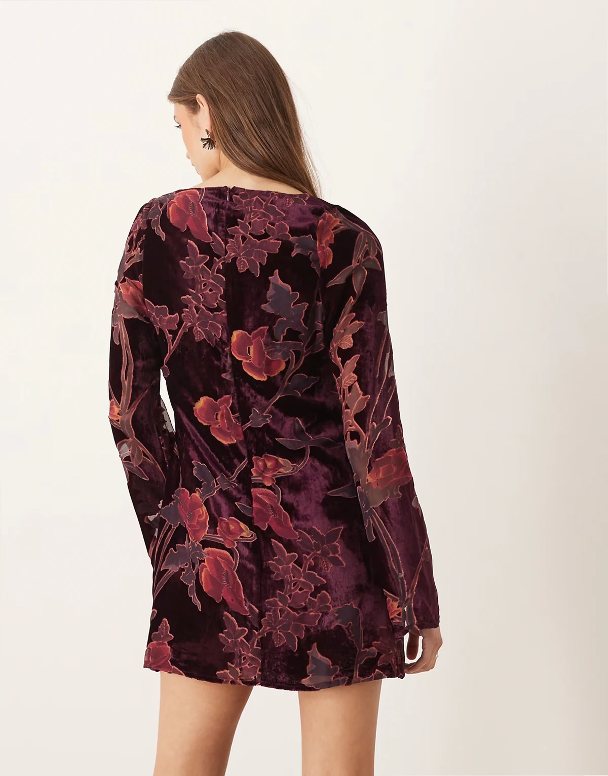 – Alitra – Langärmliges Minikleid in Burgunderrot mit V-Ausschnitt und Blumenmuster