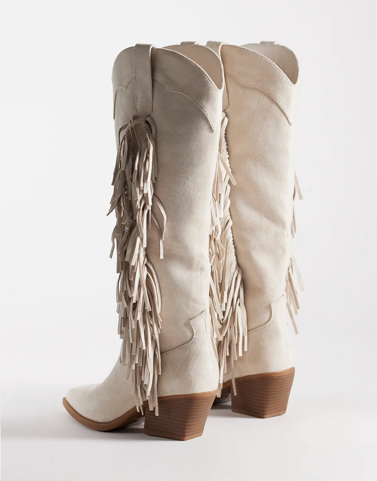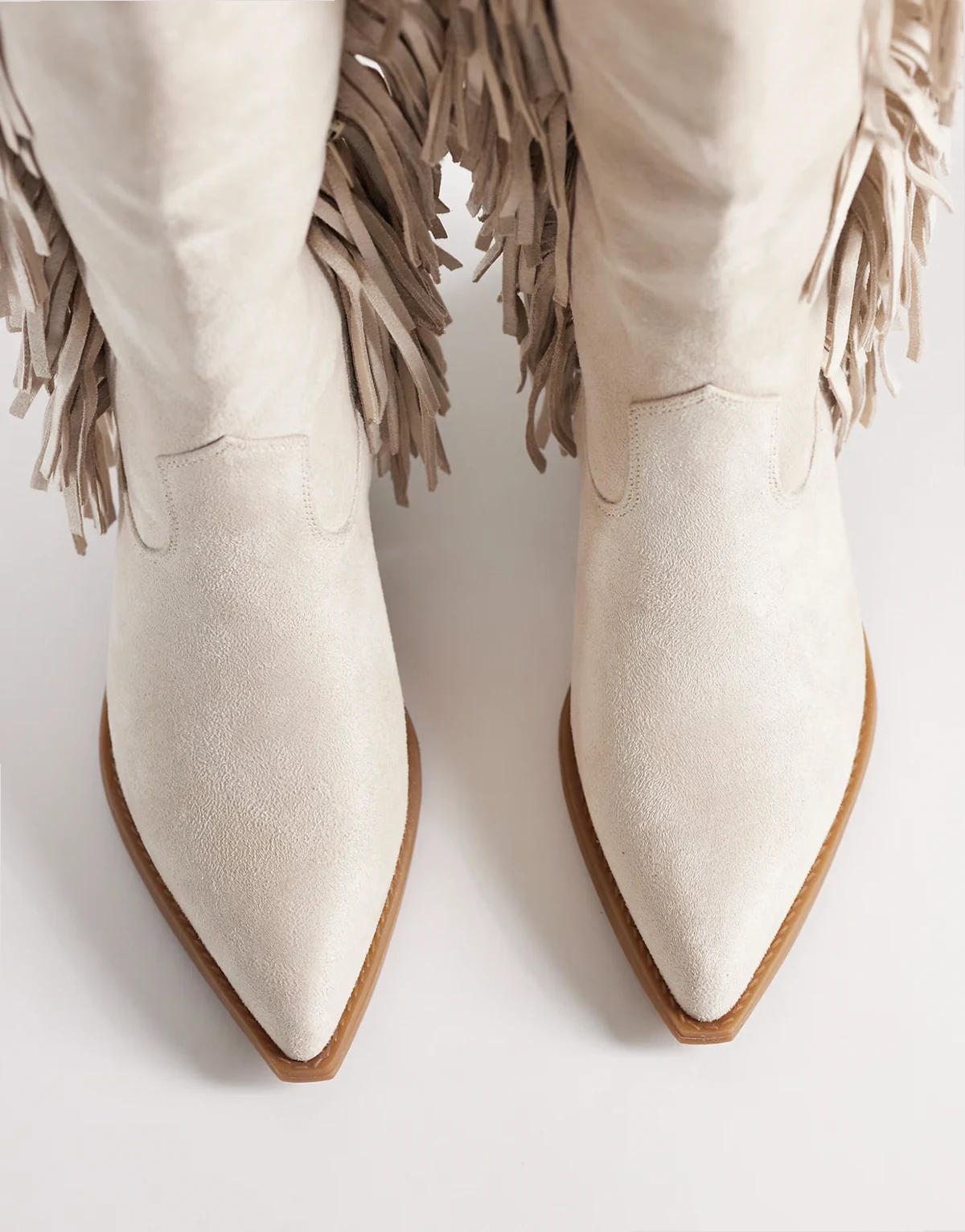 4. – Kniehohe Westernstiefel aus Wildlederimitat in Cremeweiß mit Fransen