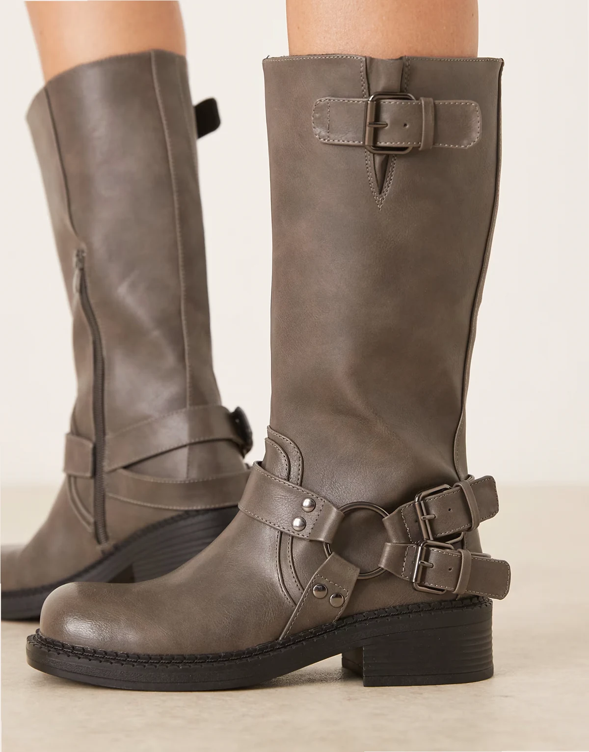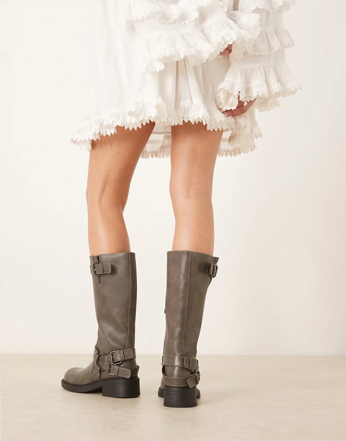 4. – Kniehohe Bikerstiefel in verwaschenem Grau mit Riemendesign