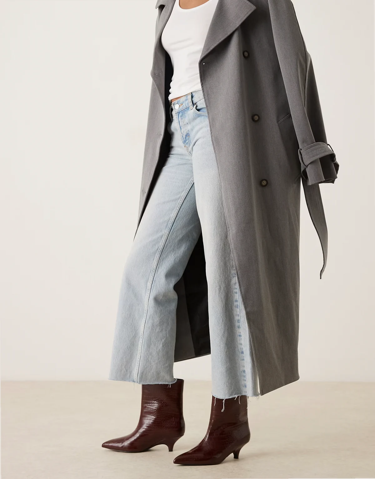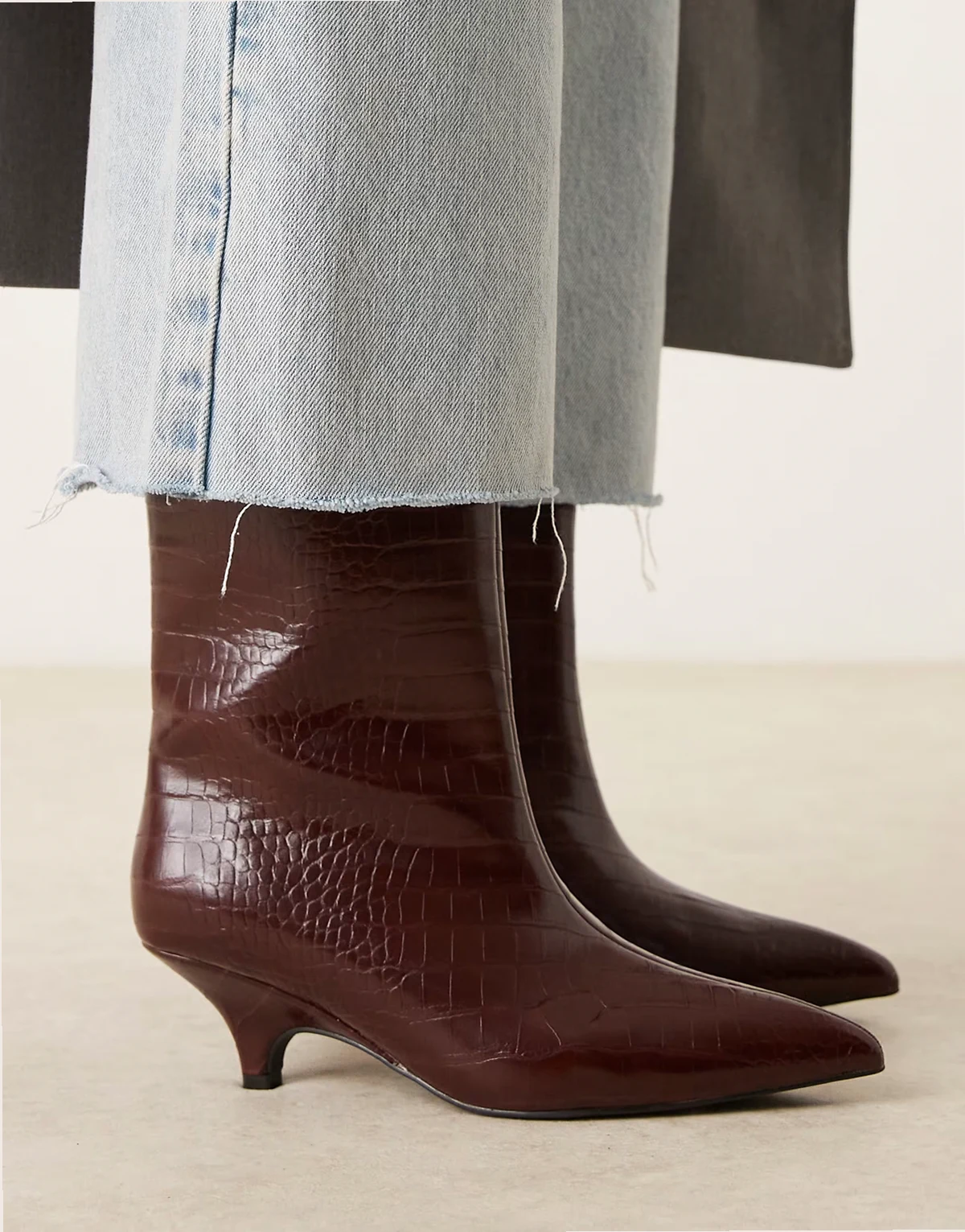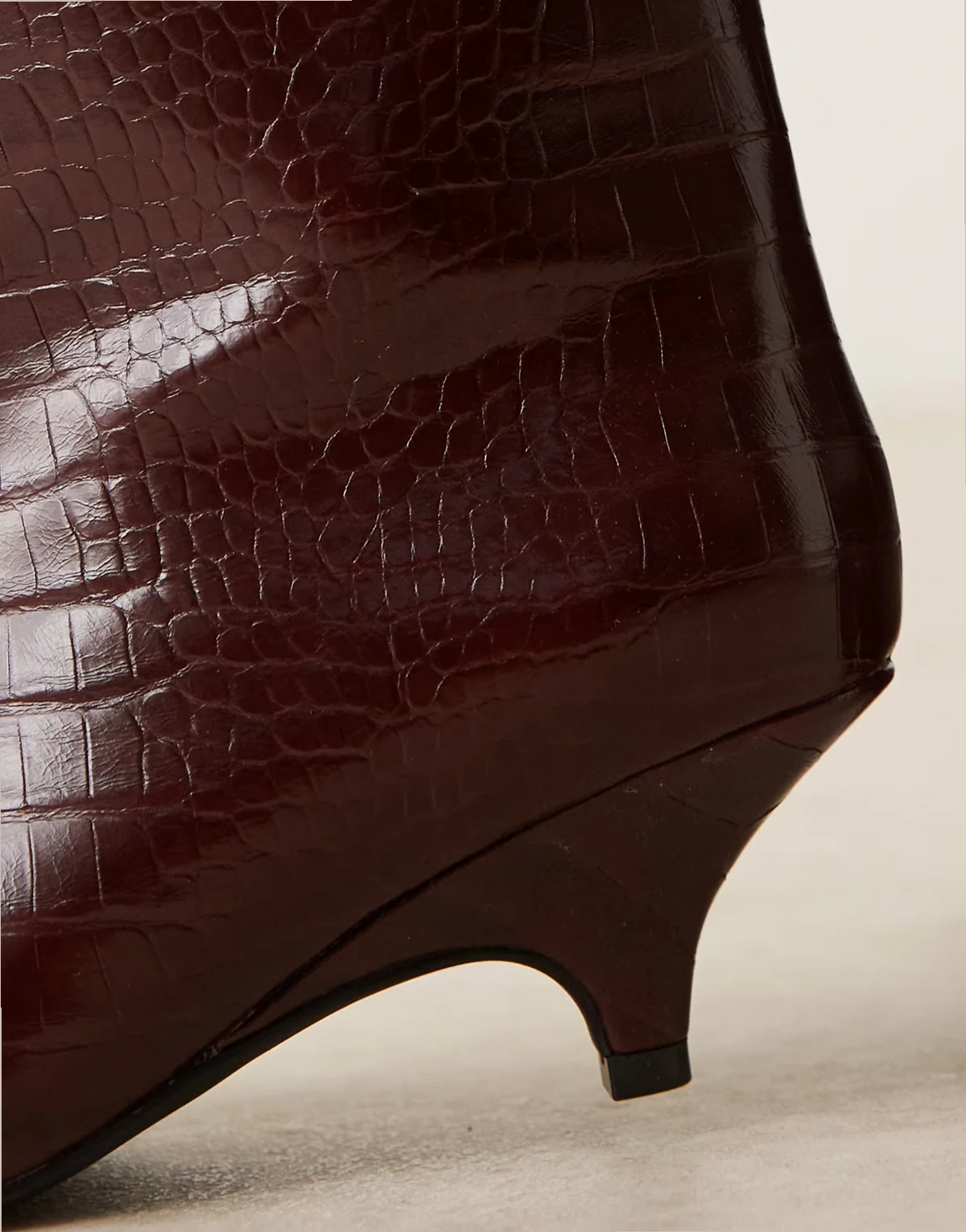 – Spitze, mittelhohe Stiefeletten in burgunderroter Kroko-Optik mit Kitten-Absatz