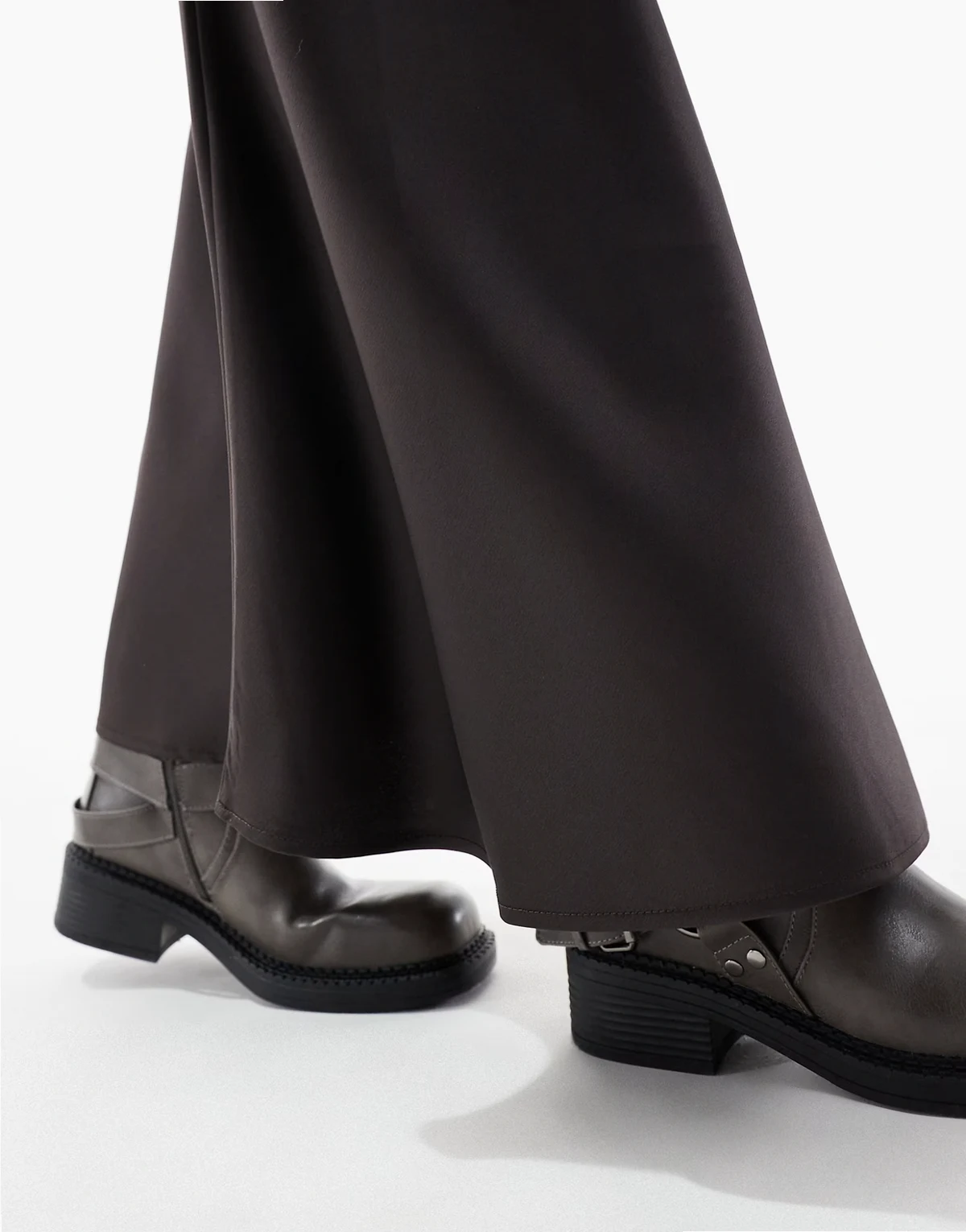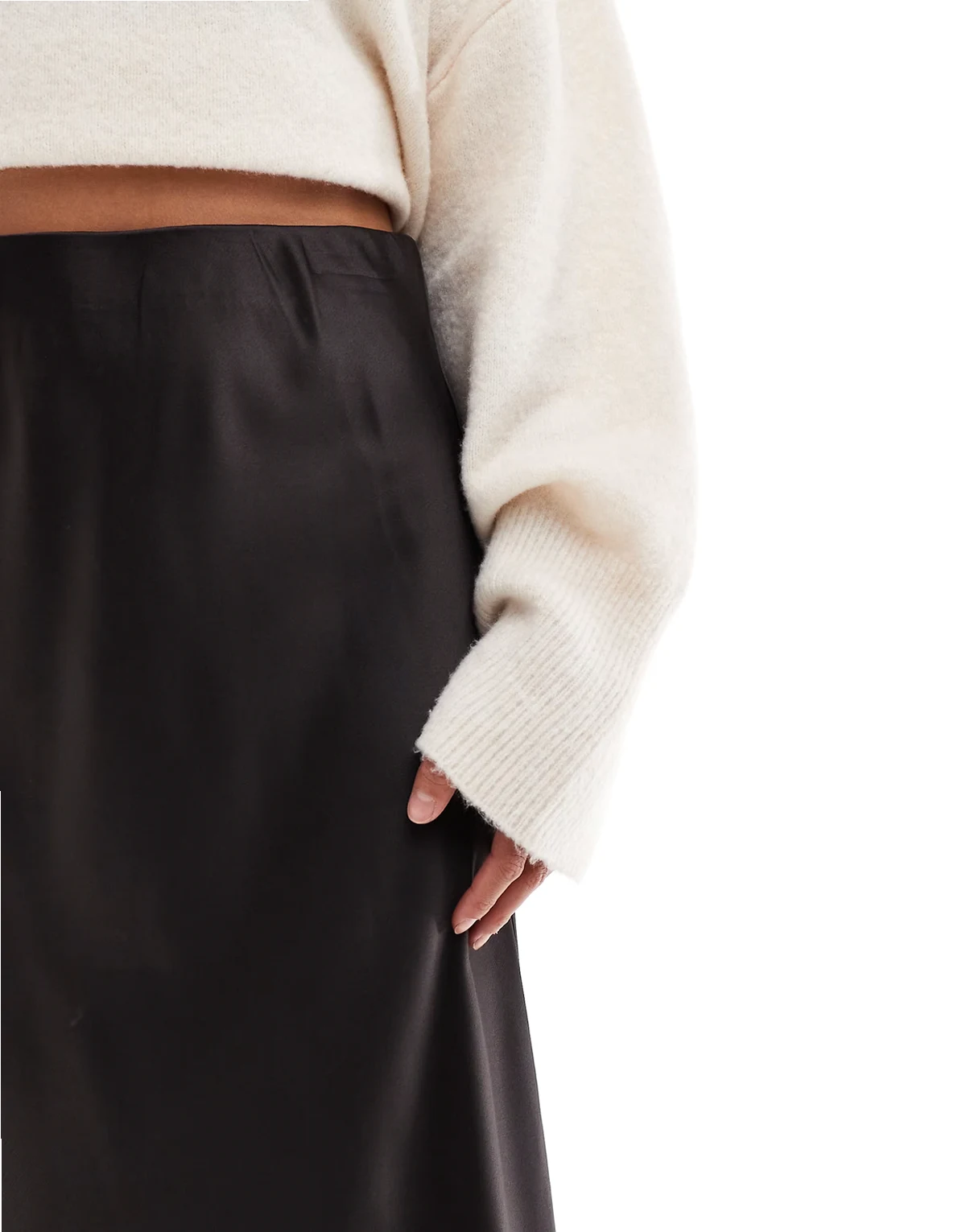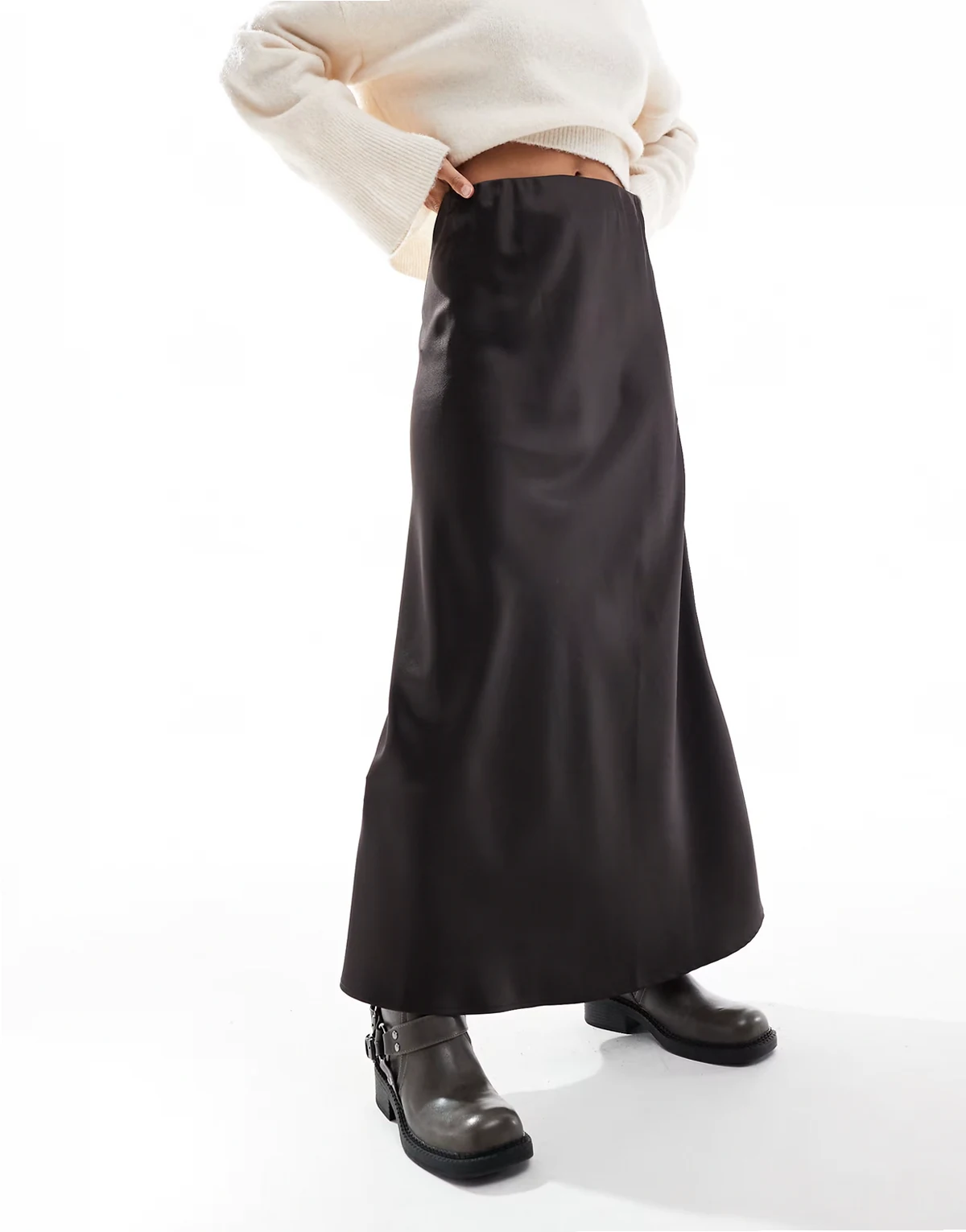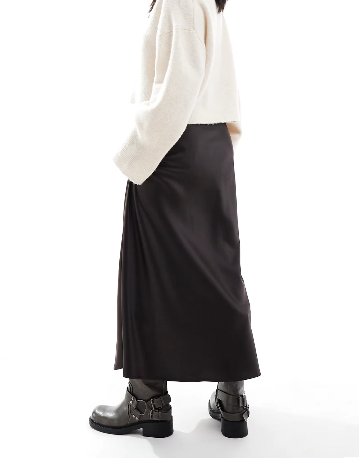 – Asymmetrischer Satin-Midirock in Schokobraun