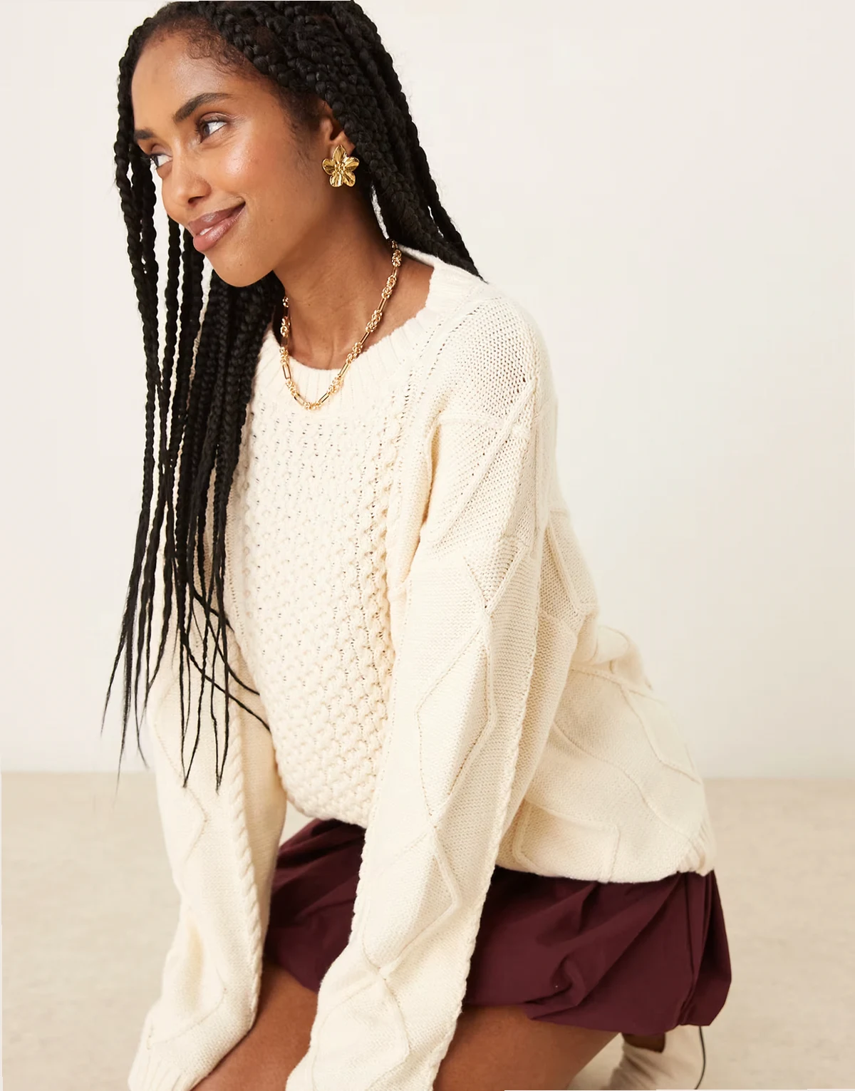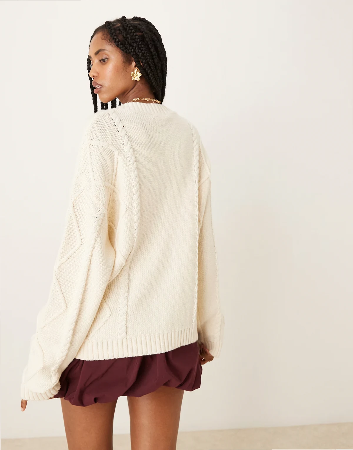 – Oversize-Strickpullover in Wollweiß mit Zopfmuster