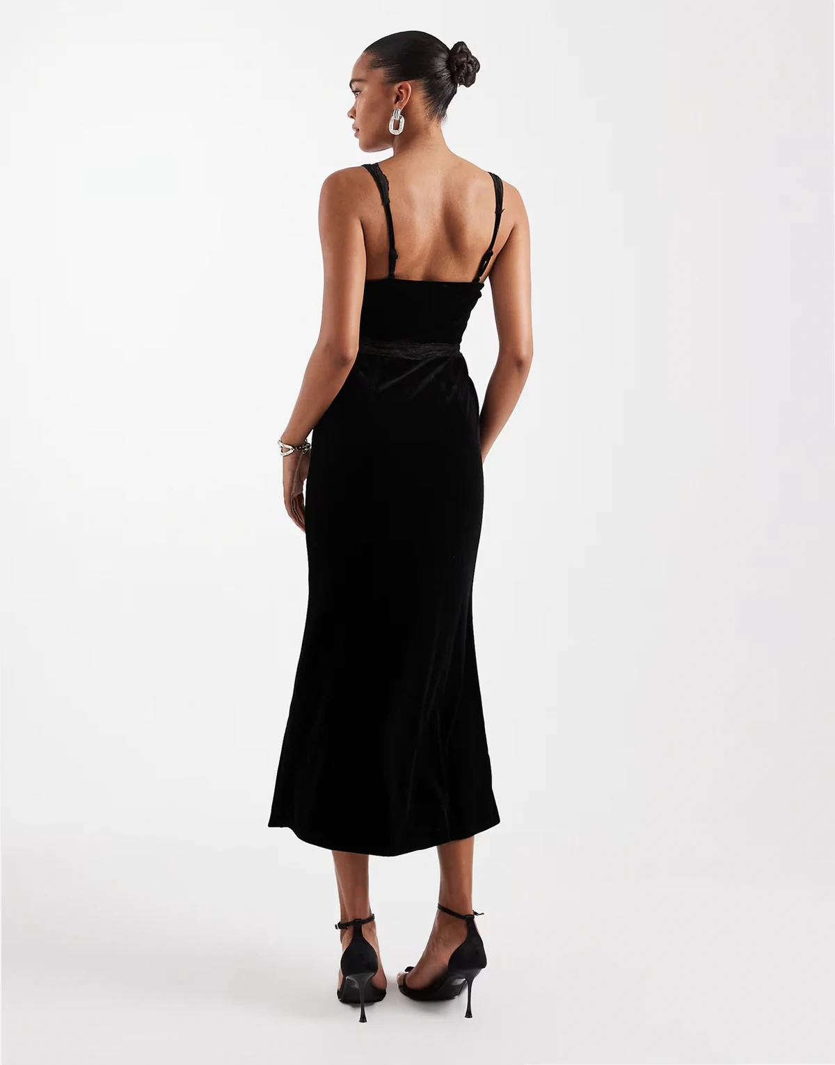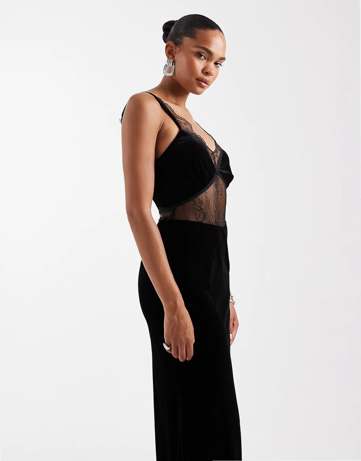 – Samt-Maxikleid in Schwarz mit Spitzeneinsätzen