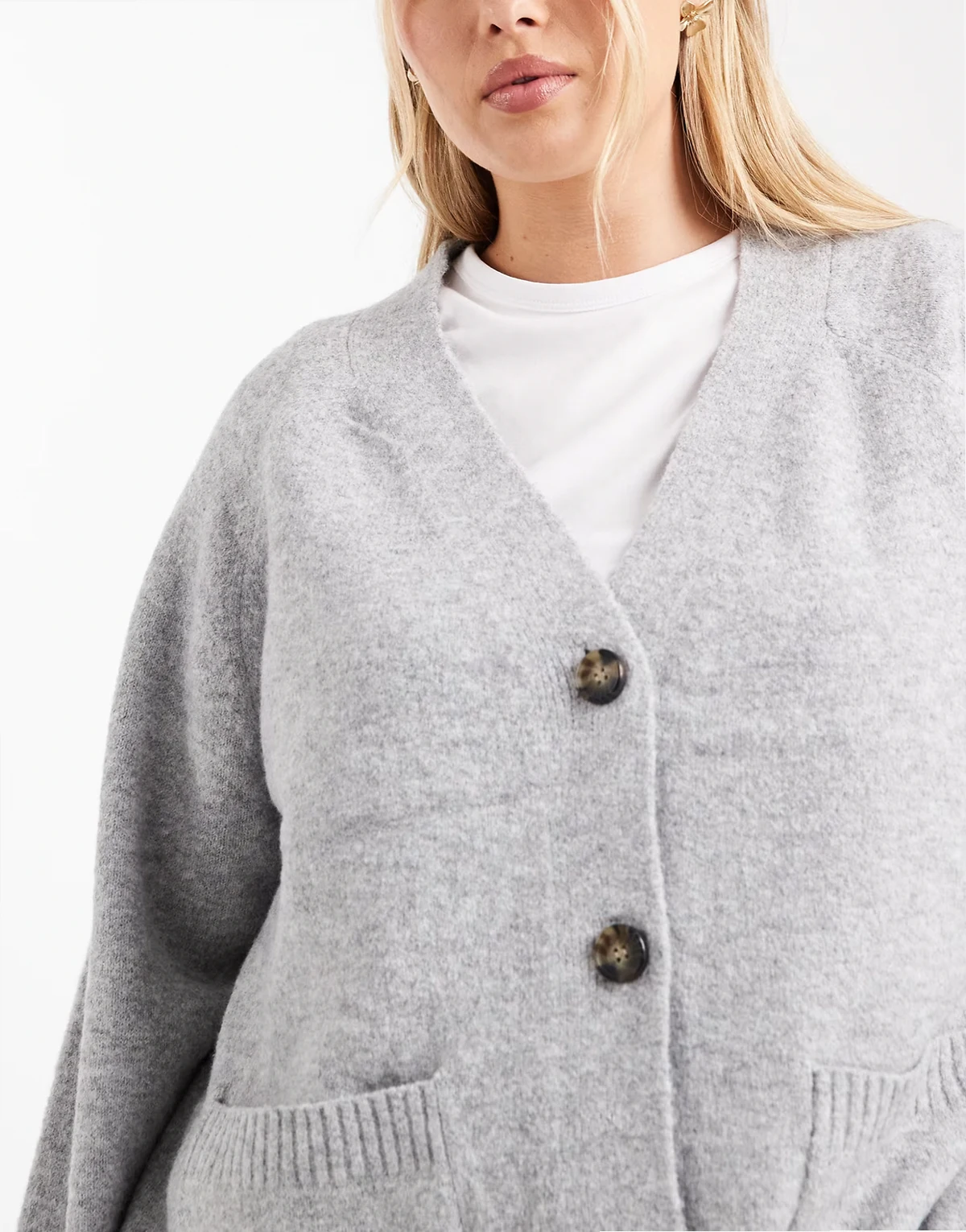 – Kastige Strickjacke in Hellgrau meliert mit Taschen