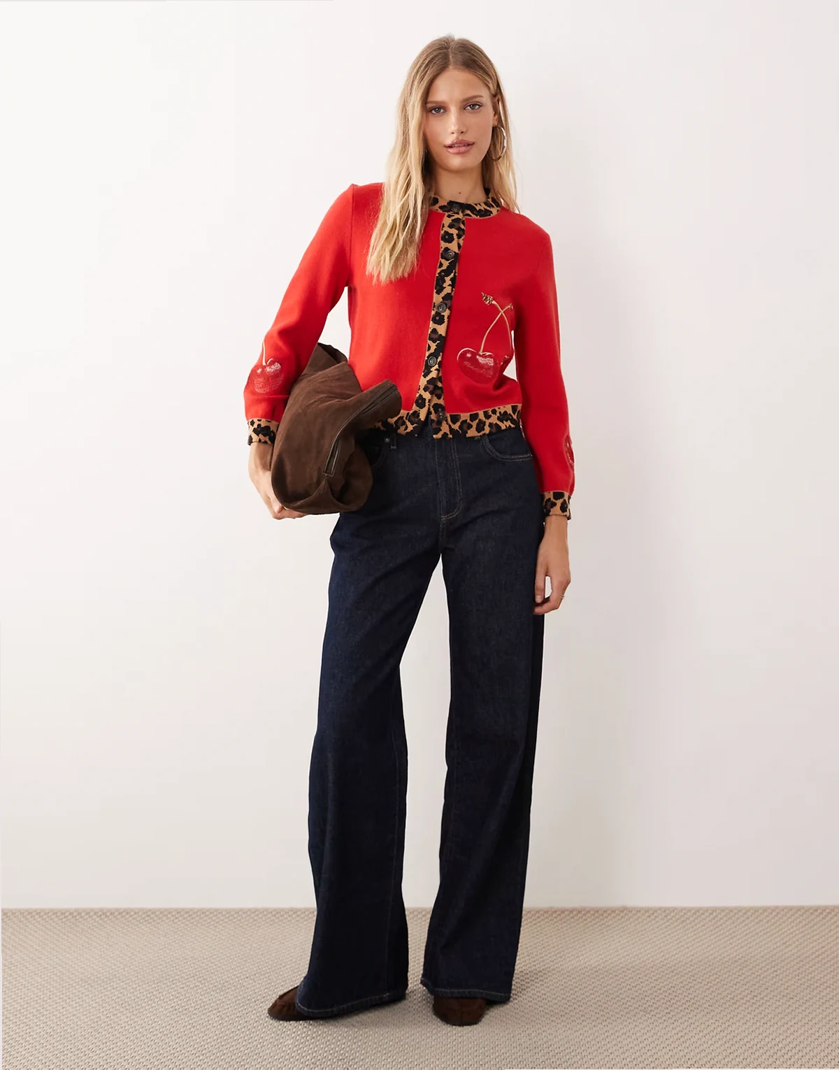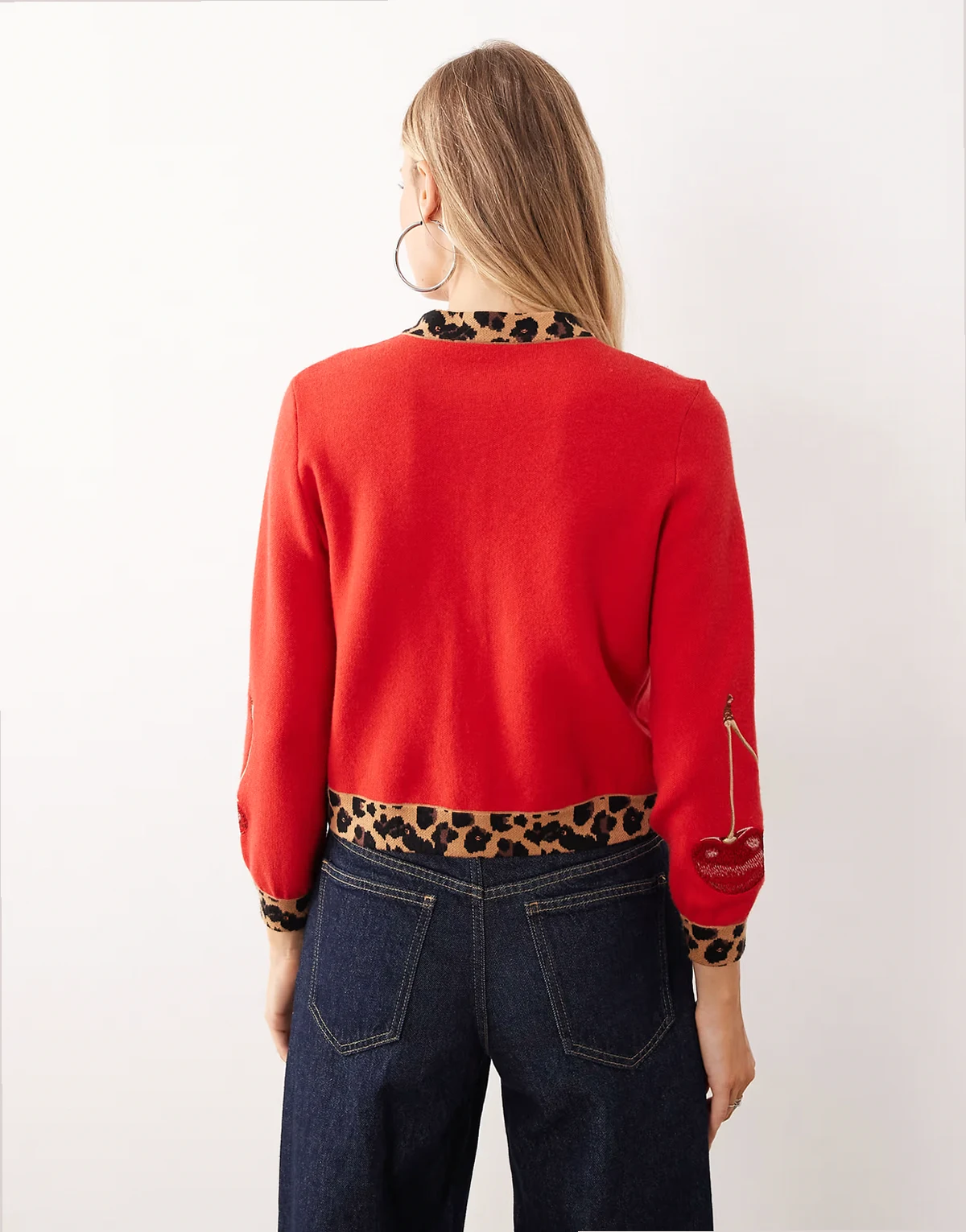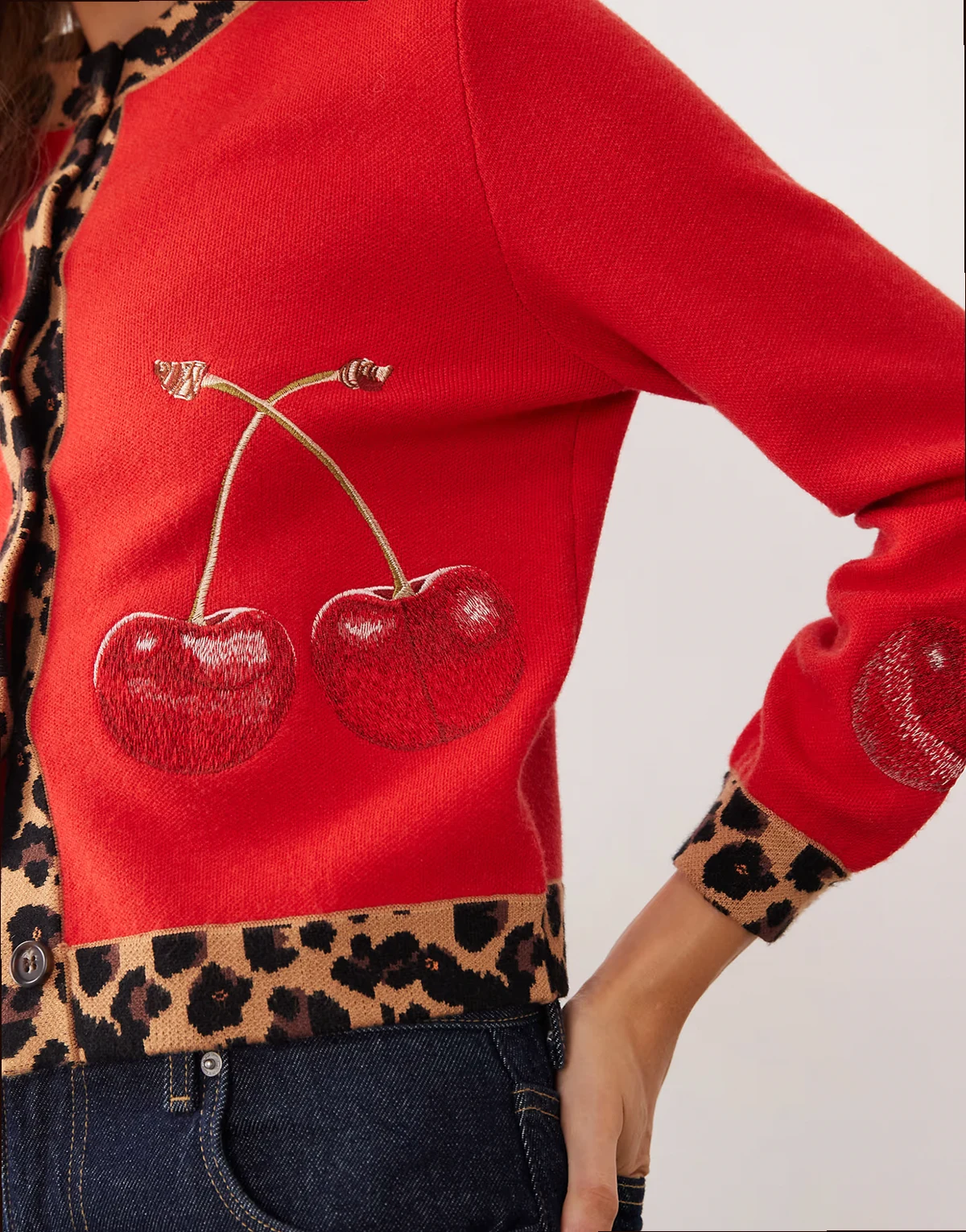 – Strickjacke in Rot mit Leopardenmuster-Rändern und aufgesticktem Kirschenmotiv