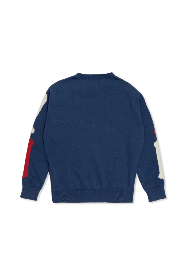 Die universelle Passform des Pullovers mit rundem Ausschnitt und langen Ärmeln ist mit dezenten Rippbündchen abgeschlossen. Einzigartige, geometrische Applikationen in den Farben Rot und Weiß zieren die Ärmel und verleihen dem Ganzen einen unverwechselbaren, designerischen Ausdruck.