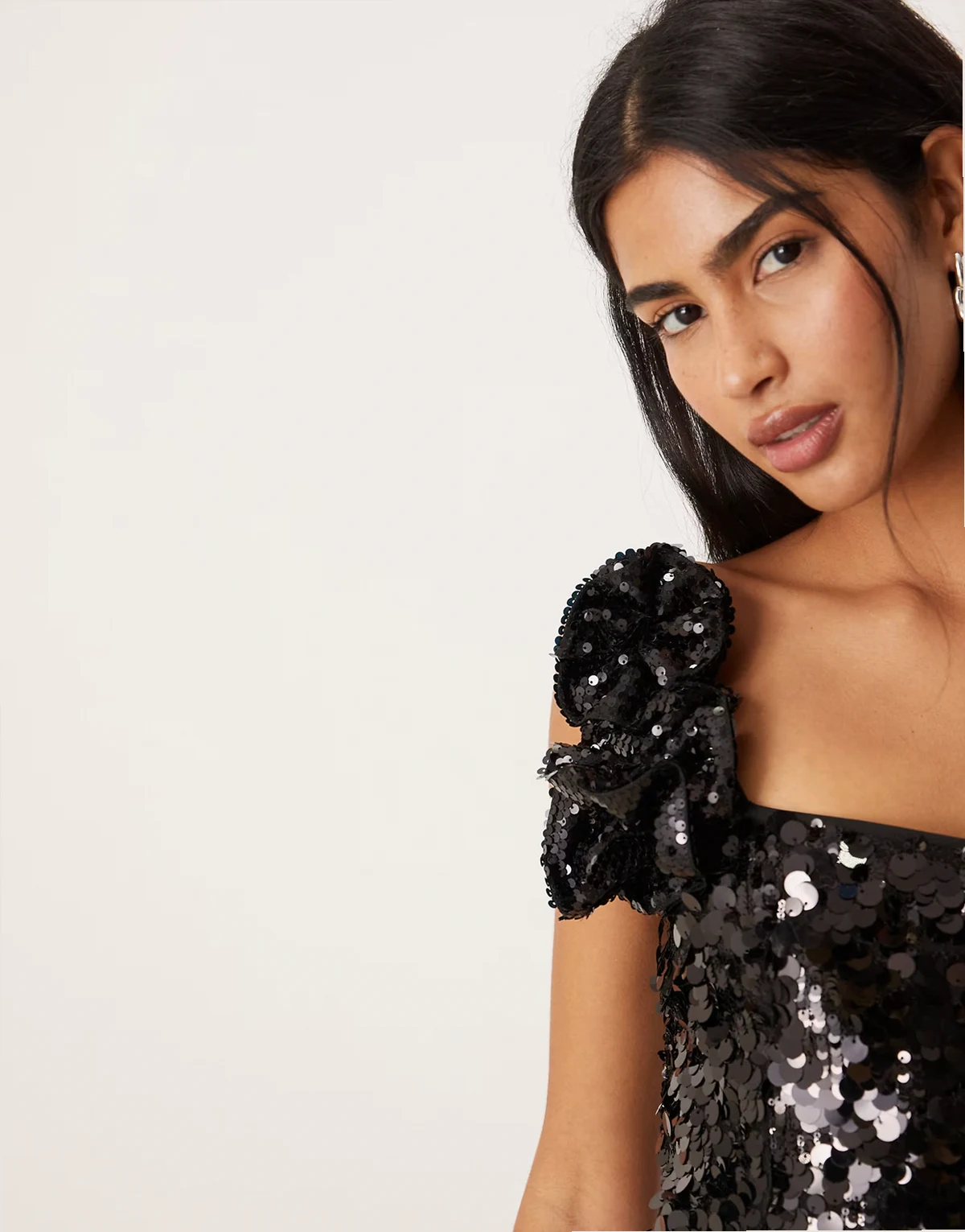 – Pailletten-Minikleid in Schwarz mit Ansteckblumen-Design an den Trägern