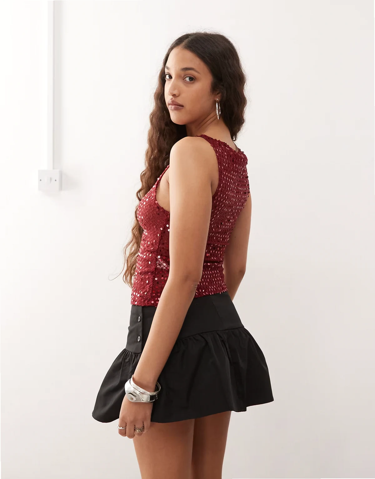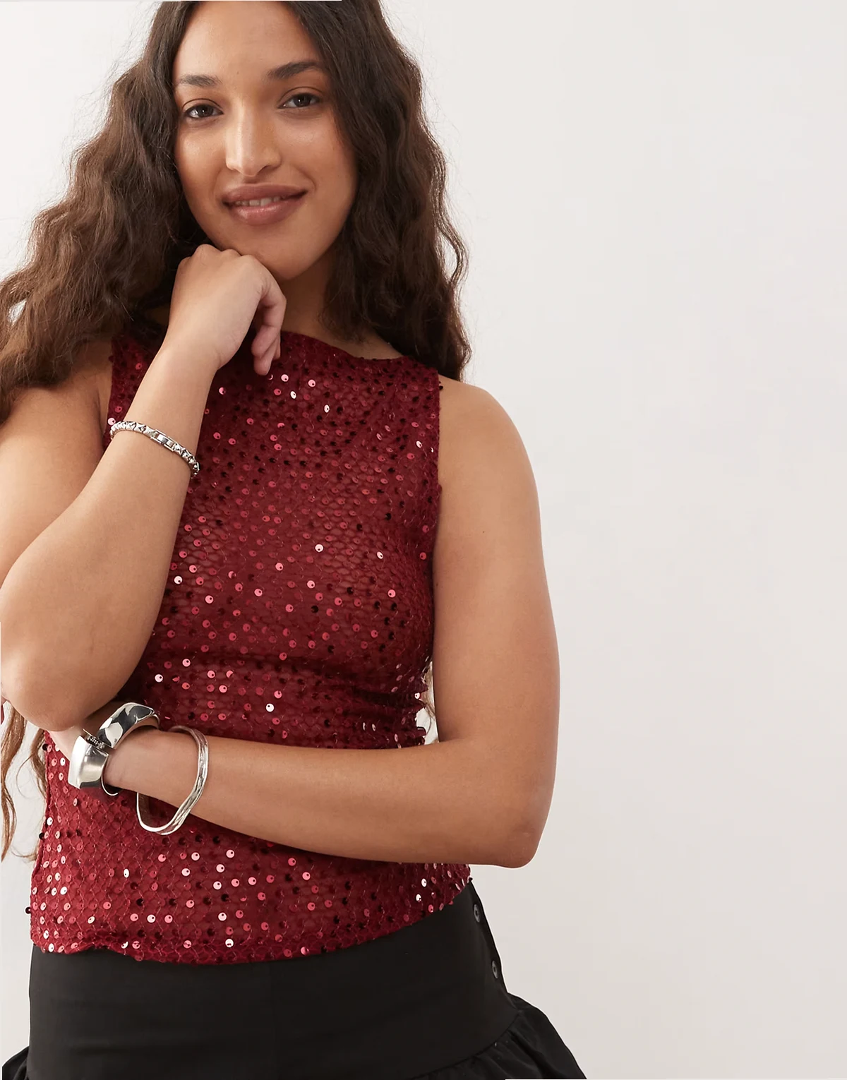 – Dudley – Gestricktes Trägertop in Burgunderrot mit Paillettenbesatz