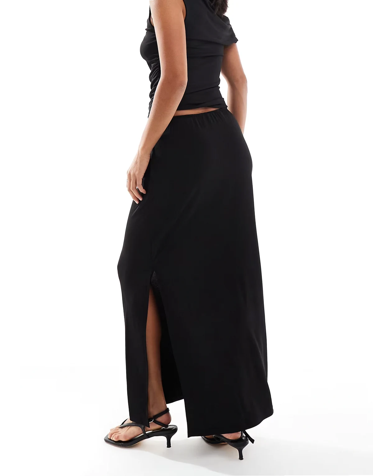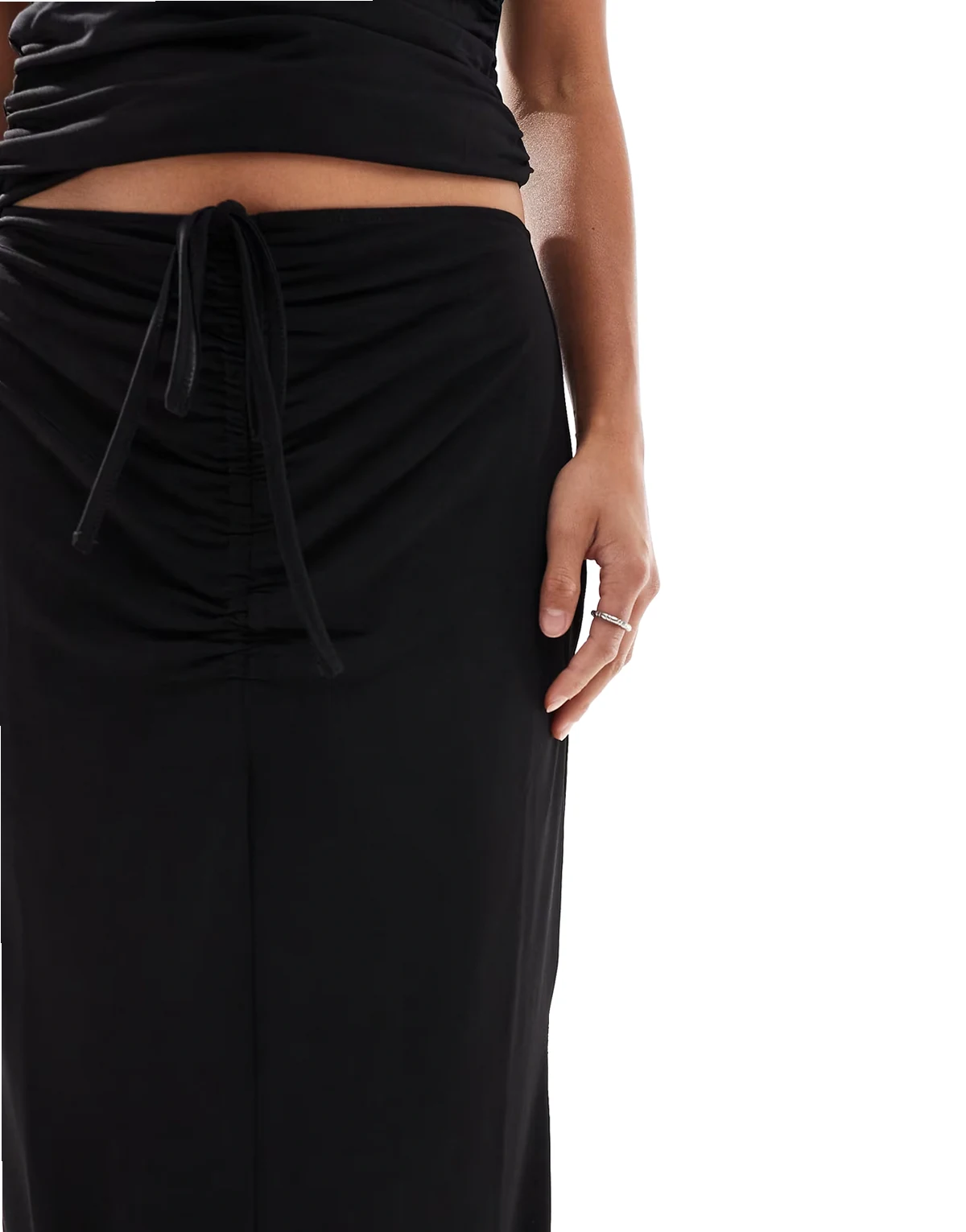 – Figurbetonter Maxirock in Schwarz mit geraffter Vorderseite, Kombiteil