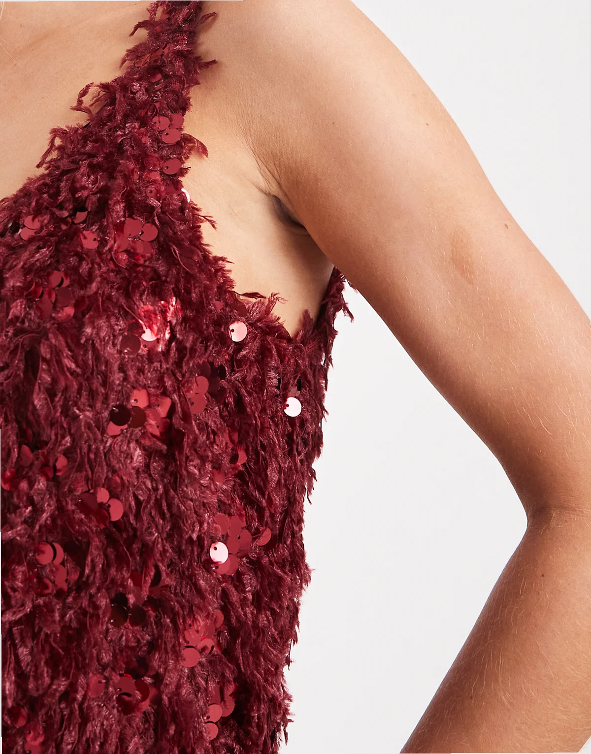 – Pailletten-Minikleid in Burgunderrot mit Kunstfeder-Finish