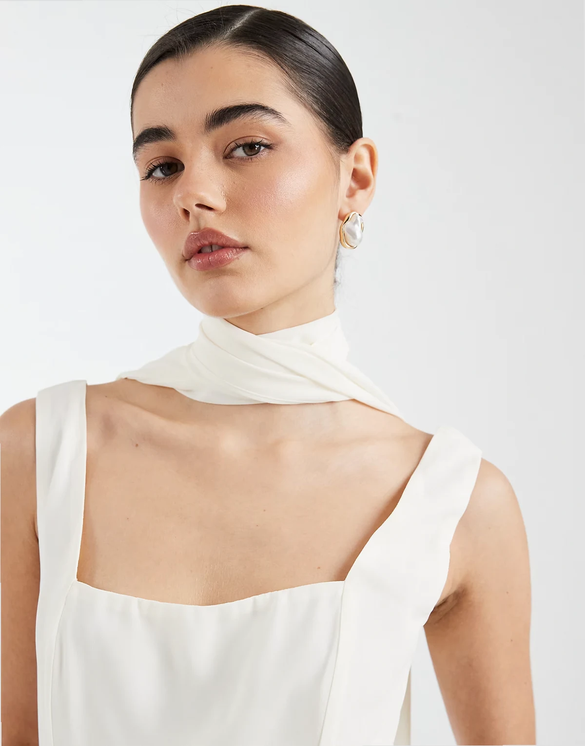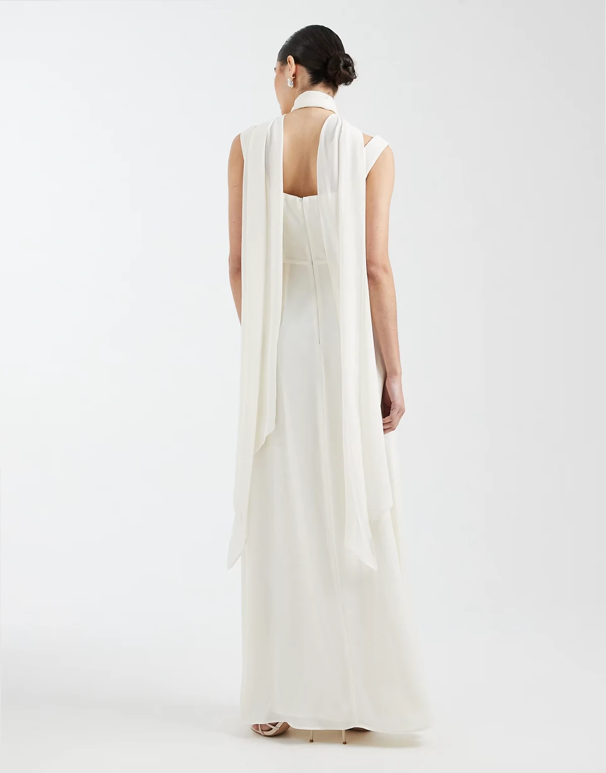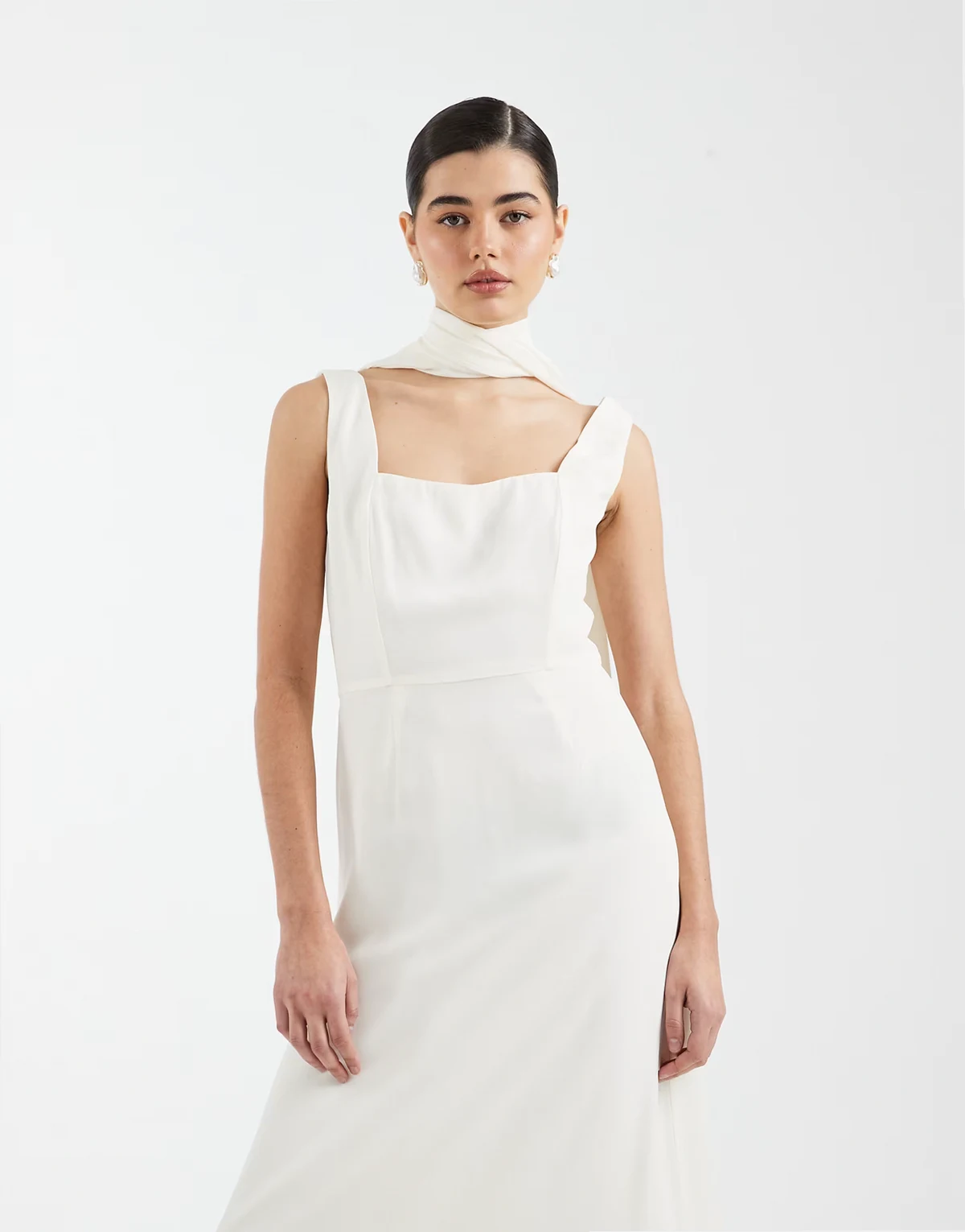 – Bridesmaid – Maxikleid aus Crepe in Elfenbeinweiß mit eckigem Ausschnitt und Schal am Ausschnitt