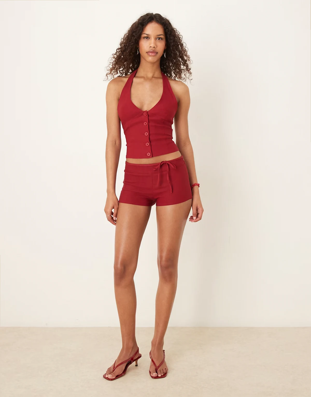 – Schmal geschnittene Shorts in Rot mit niedrigem Bund und Gürtel
