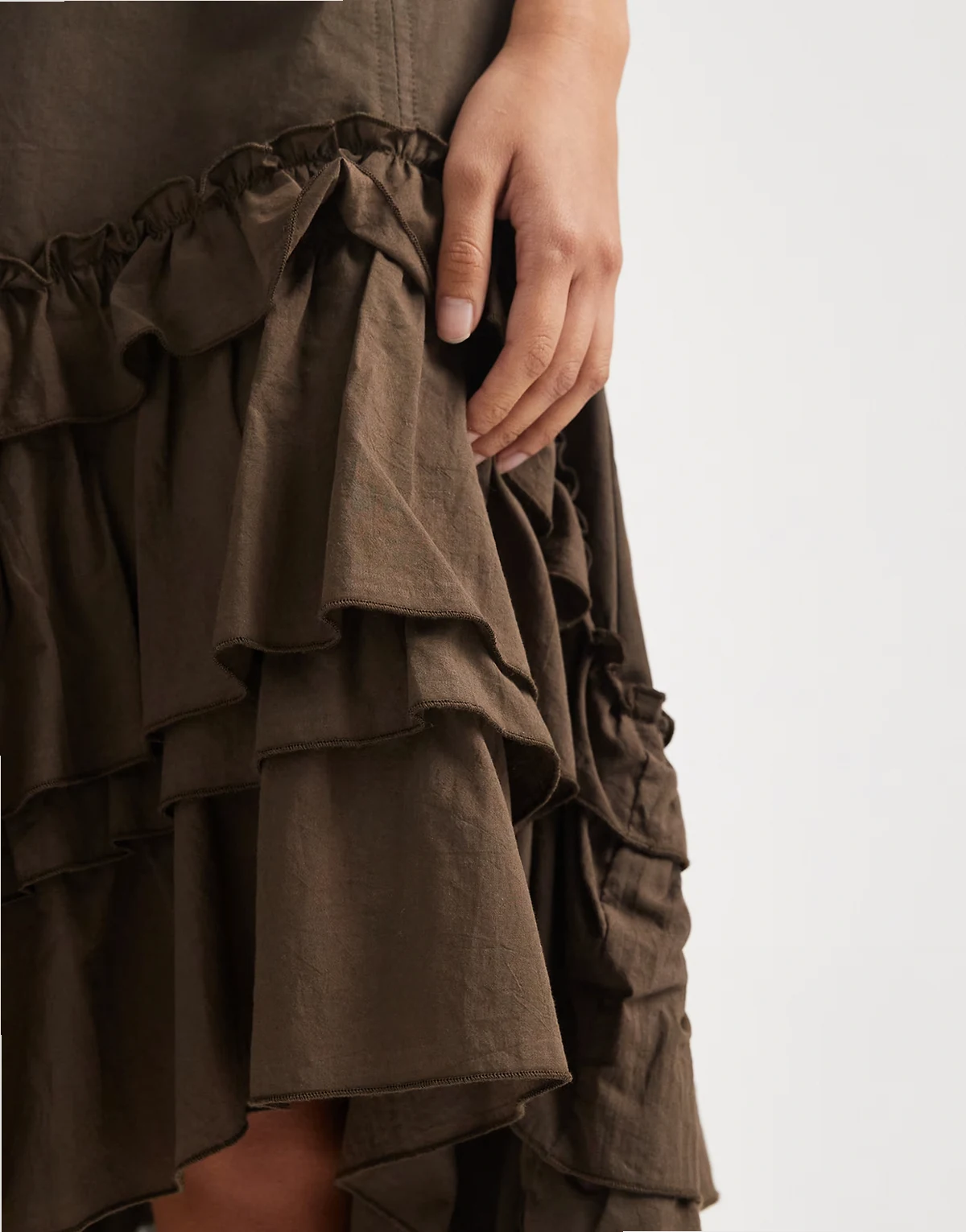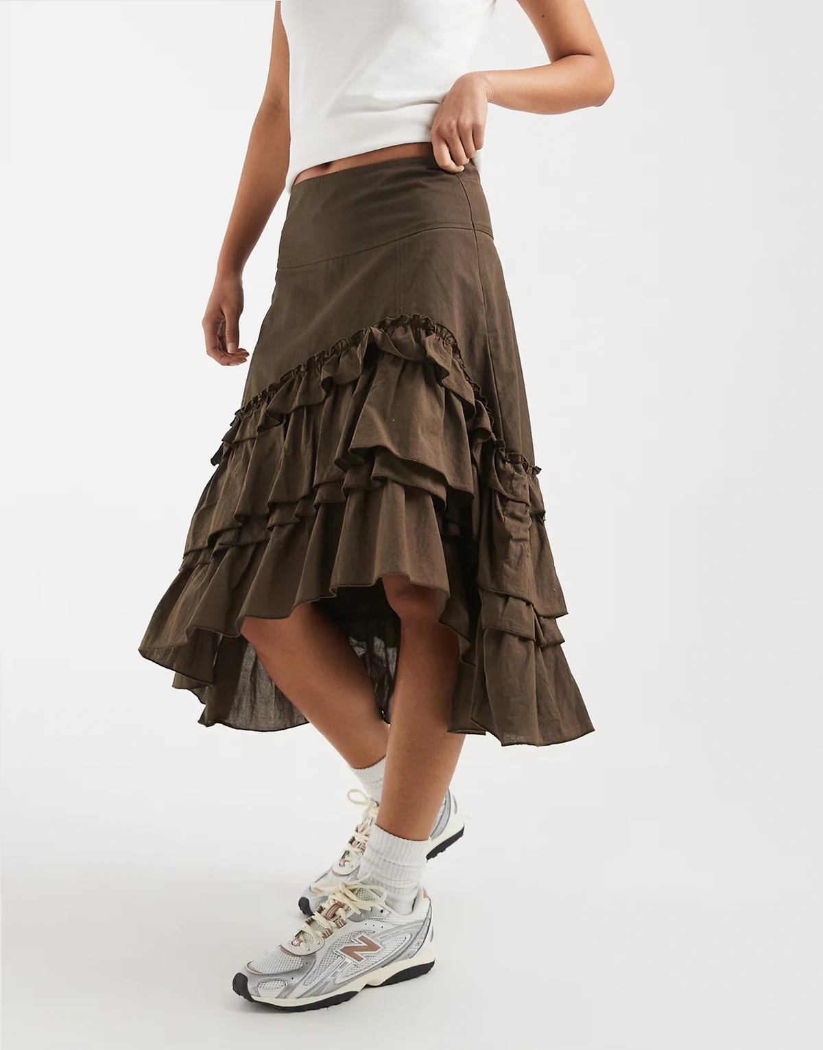 – Asymmetrischer Midirock in Braun mit Rüschen