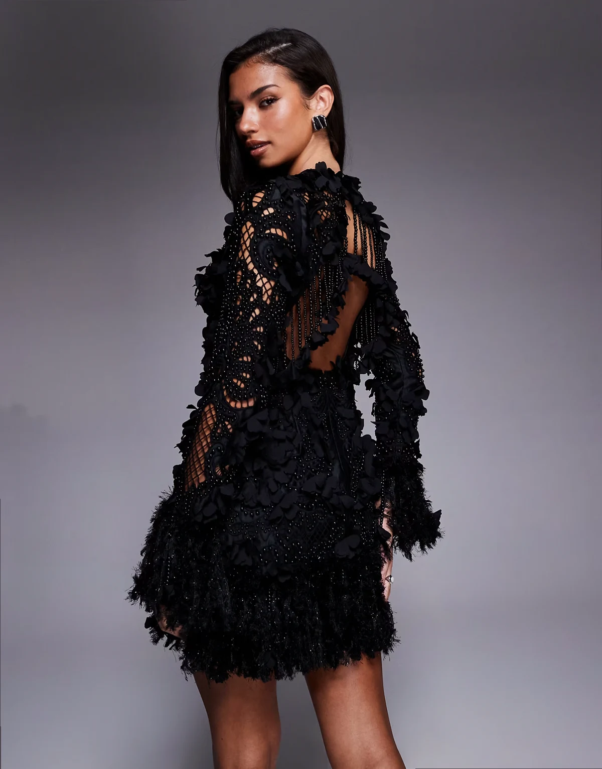 – Minikleid mit Lochmuster in Schwarz mit 3D-Blumenverzierung und Kunstfederbesatz