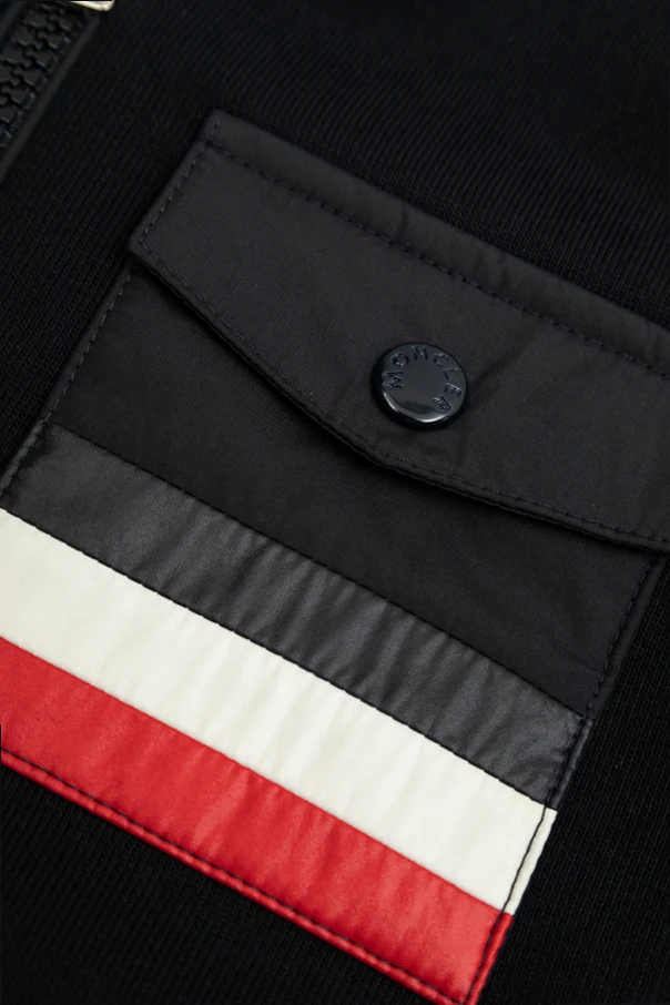 Ein einzigartiges Detail ist die Klappentasche auf der linken Brust, die mit drei horizontalen Streifen in Schwarz, Weiß und Rot verziert und mit einem Knopf verschlossen ist. Auf dem linken Ärmel befindet sich ein Designer-Logo-Patch, und der Reißverschluss-Schieber ist mit eingraviertem Logo verziert, was die Liebe zum Detail unterstreicht.
