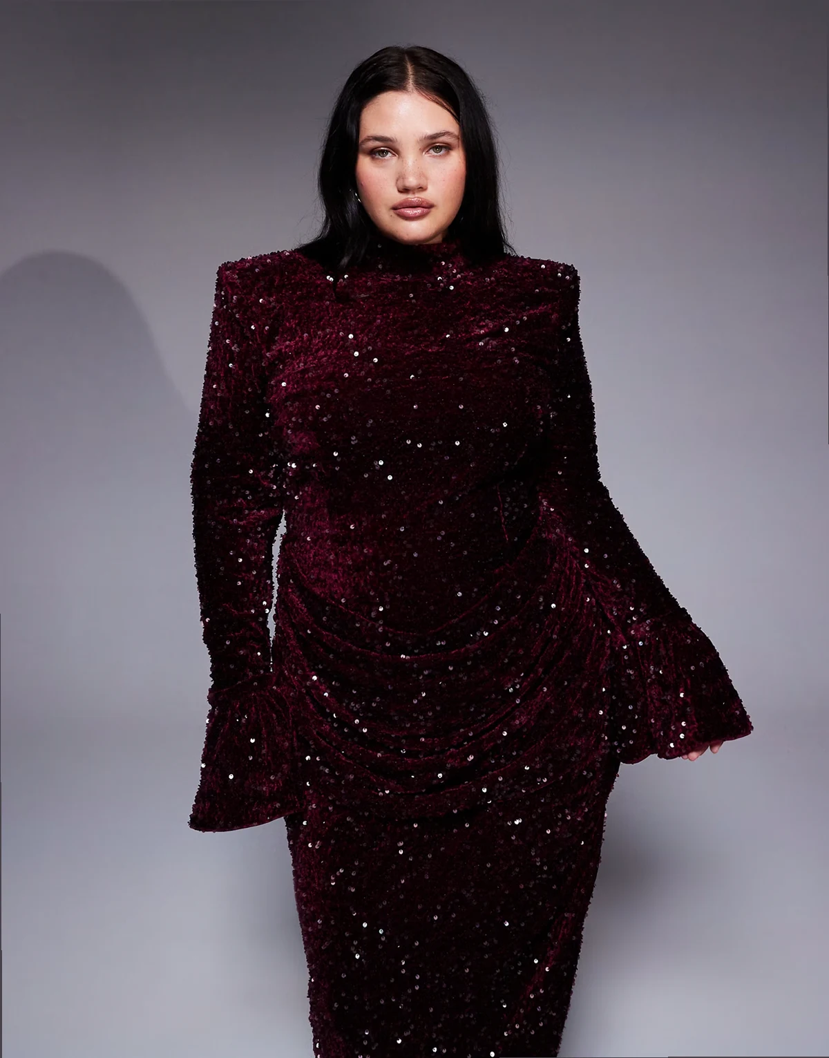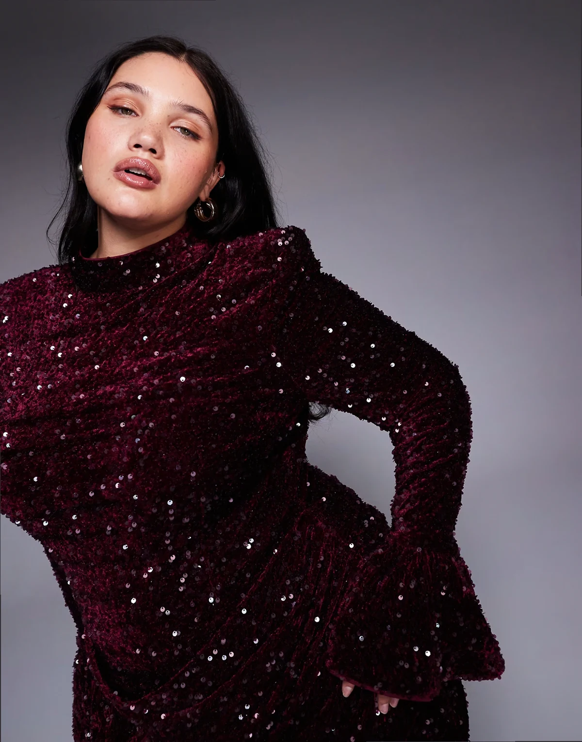 Curve – Samt-Maxikleid in Burgunderrot mit Paillettenbesatz und drapierter Taille