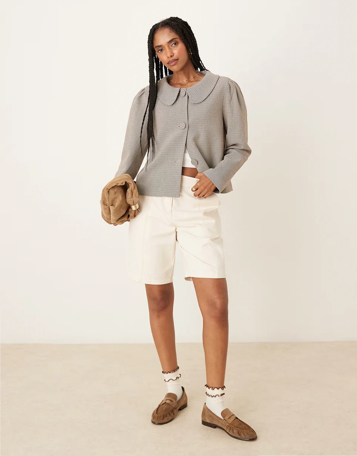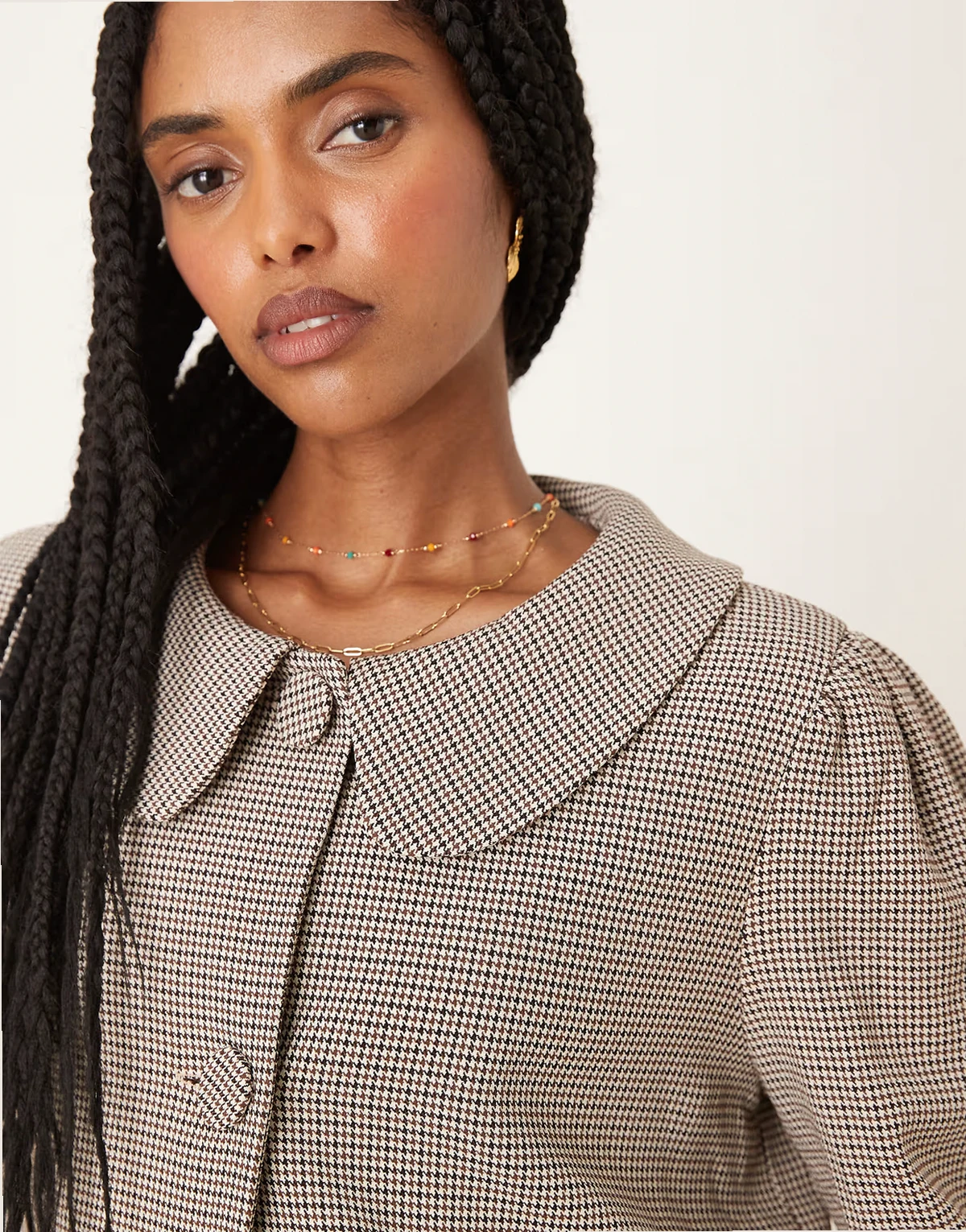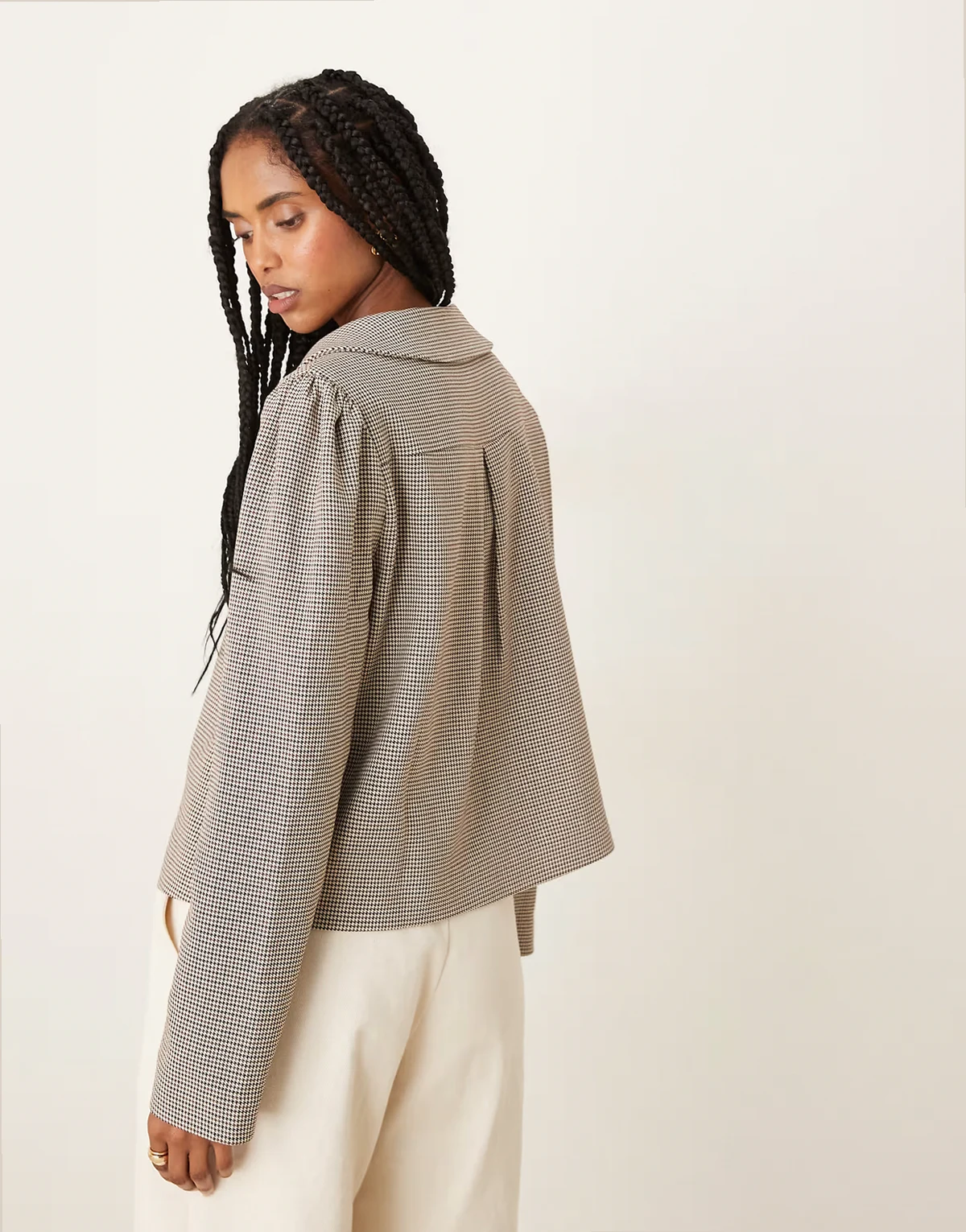 – Cropped Mantel im Caban-Stil mit braunem Hahnentrittmuster und lockerem, weitem Schnitt