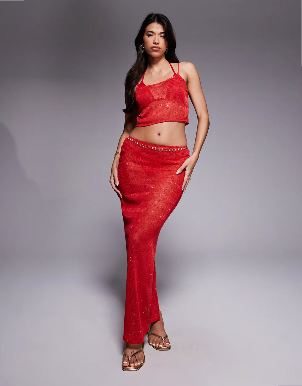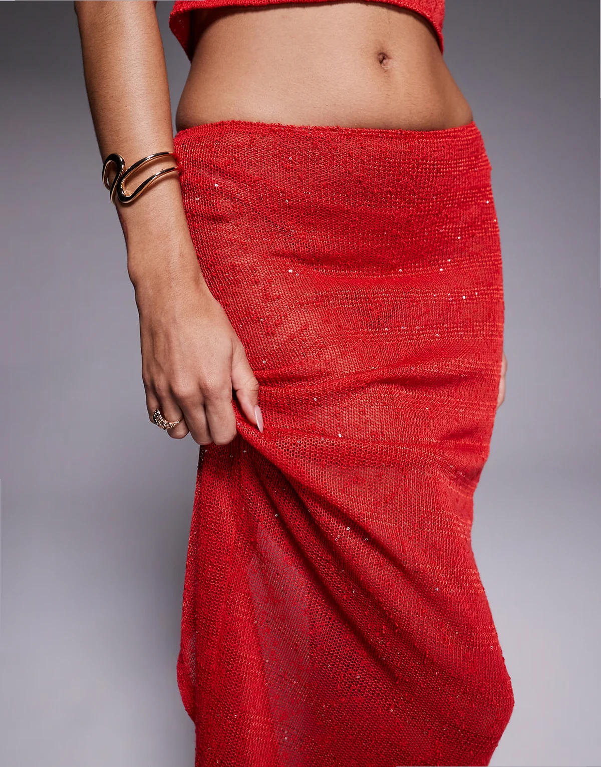 – Gestrickter Maxirock mit Paillettenbesatz in Rot