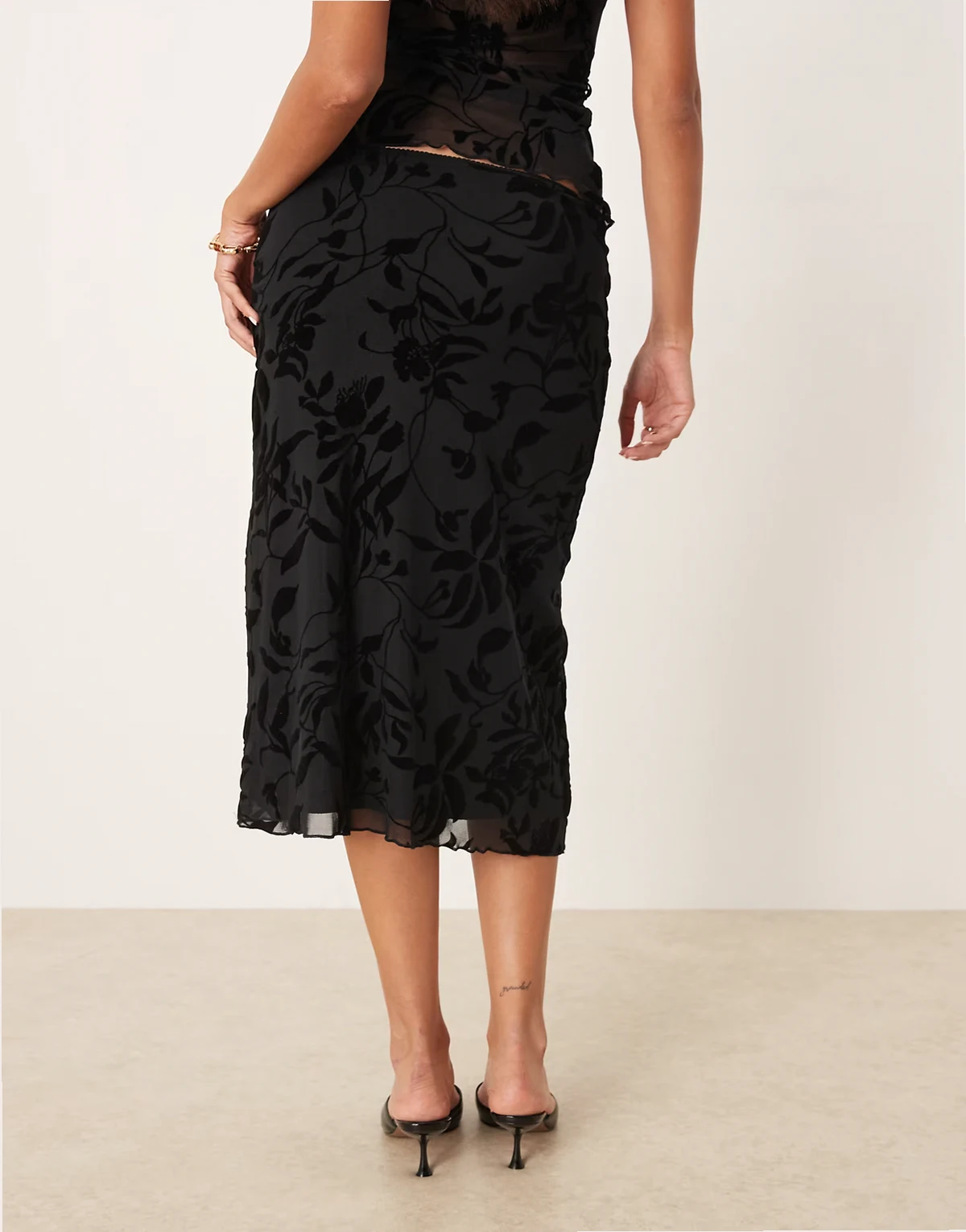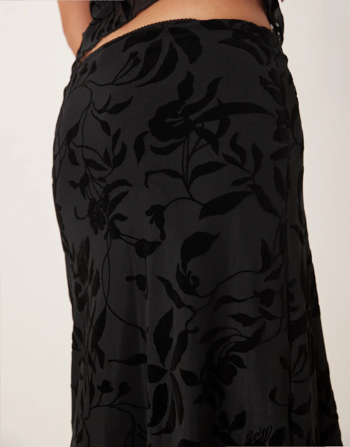 – Atira – Midirock in Schwarz mit beflocktem Blumenmuster und niedrigem Bund, Kombiteil