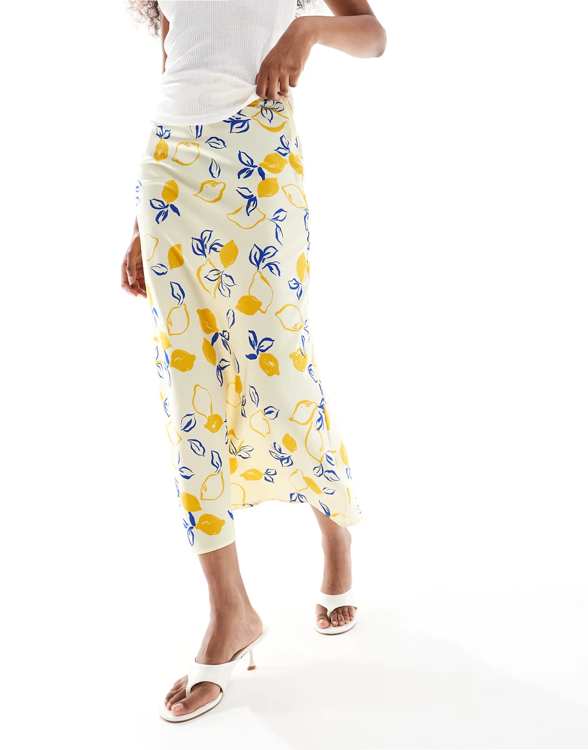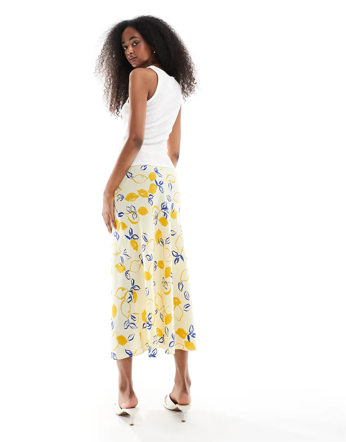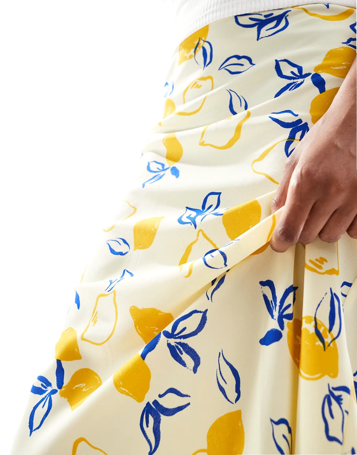 – Asymmetrischer Midaxirock in Gelb mit Zitronenmuster