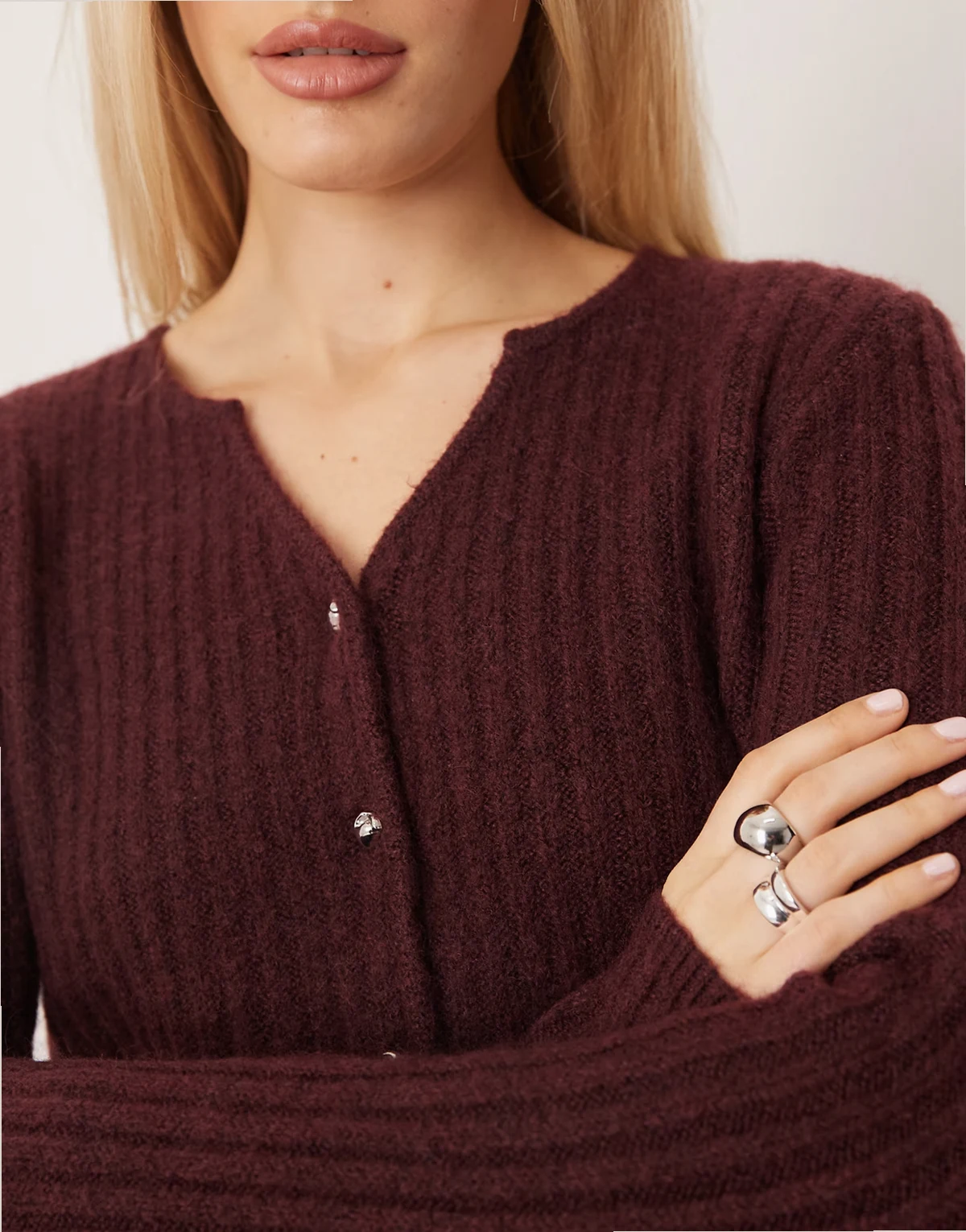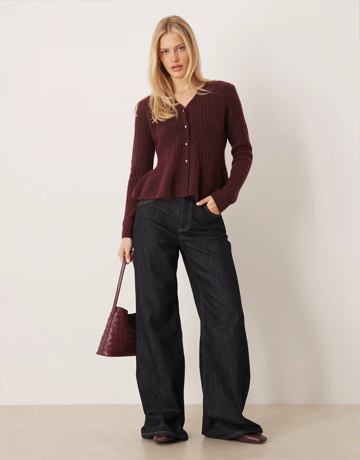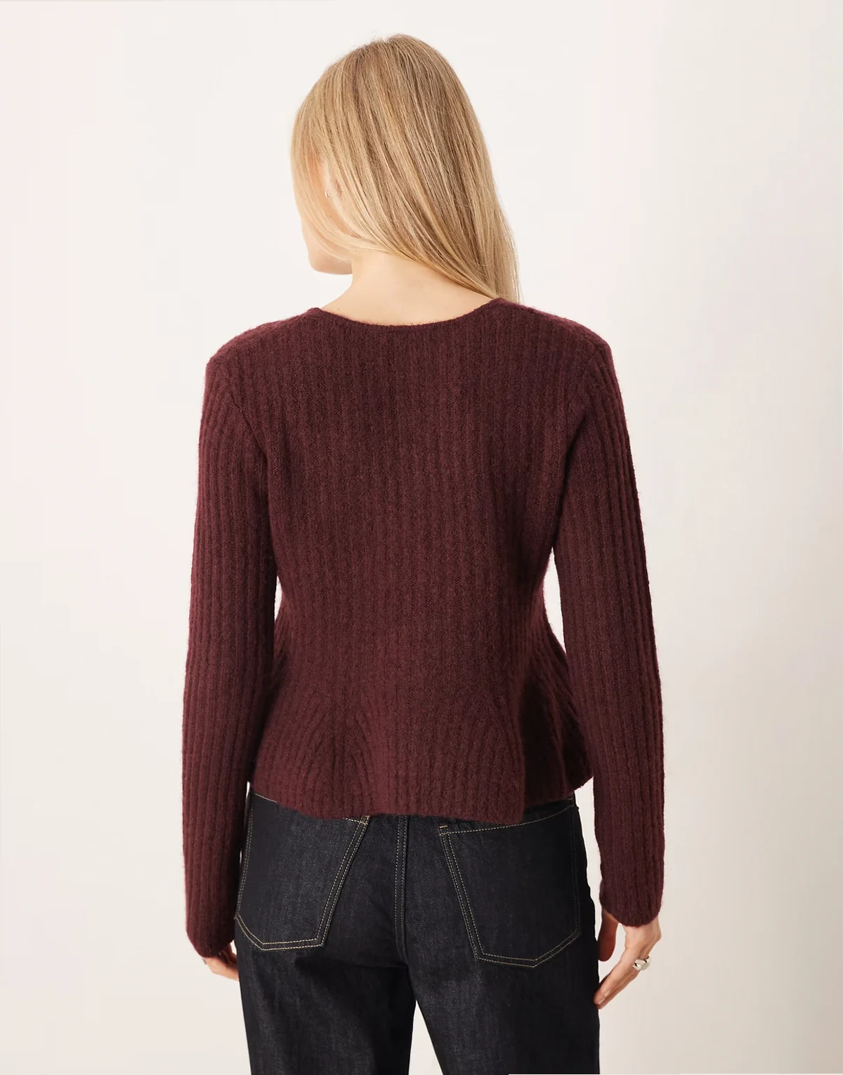 – Strickjacke in Burgunderrot mit Schößchensaum