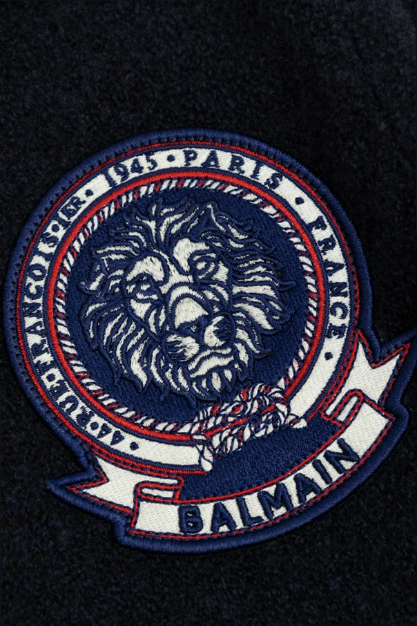 Die glatte, einfarbige Oberfläche des Pullovers wird von einer großen, auffälligen Applikation geziert – das Löwenmotiv sowie präzise ausgeführte Schriftzüge mit dem Markennamen, dem Entstehungsort und dem Gründungsjahr setzen ein einzigartiges Statement und ziehen alle Blicke auf sich. Drei goldene Knöpfe mit dezenten Gravuren, das charakteristische Markenzeichen der Olivier Rousteing -Entwürfe, verleihen zusätzlichen Prestige.