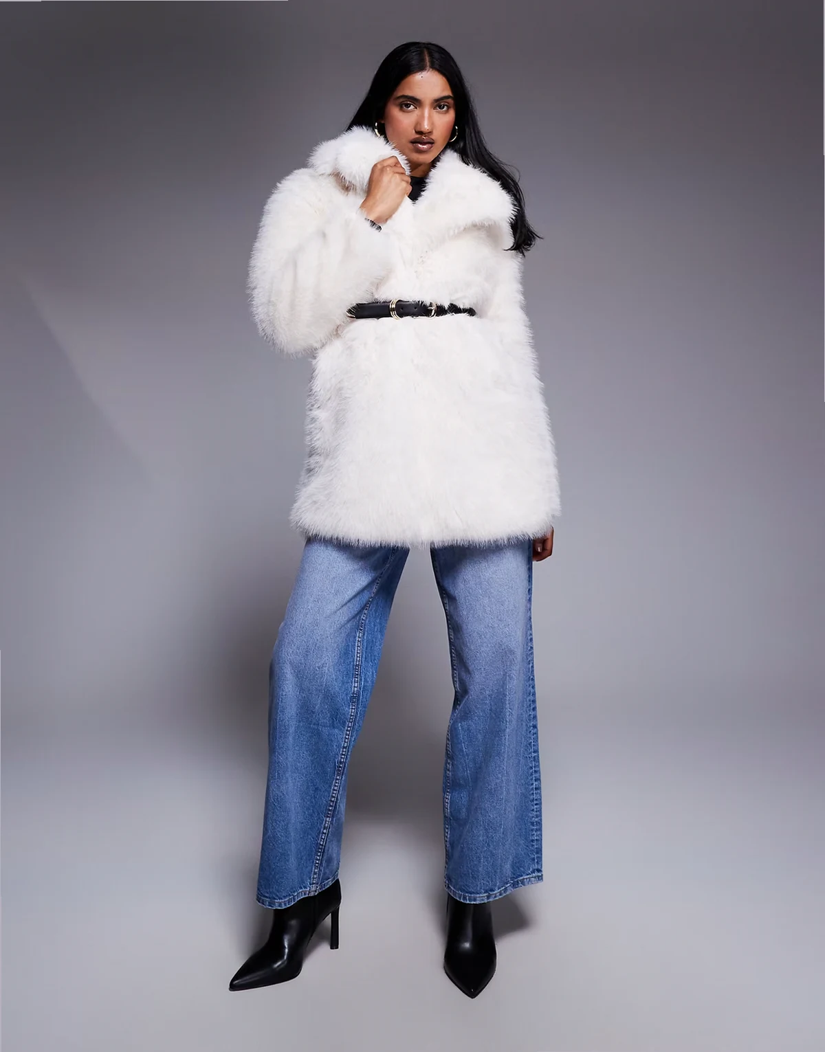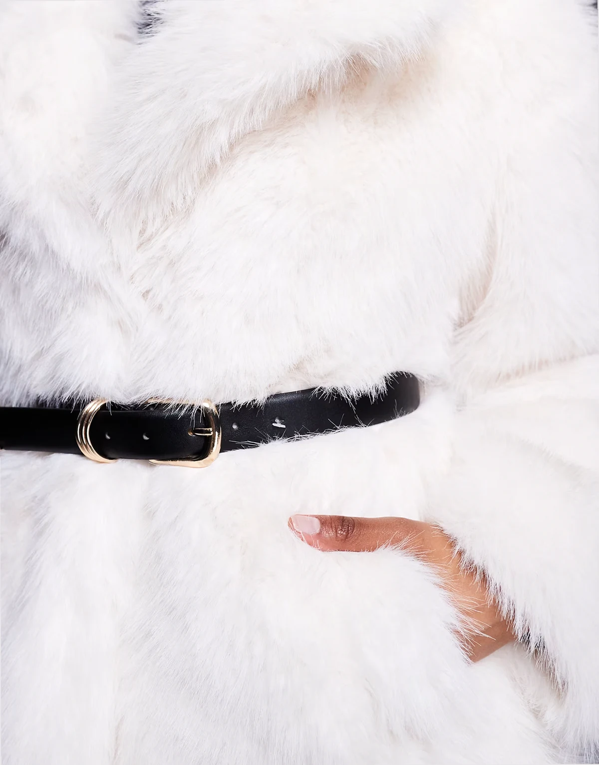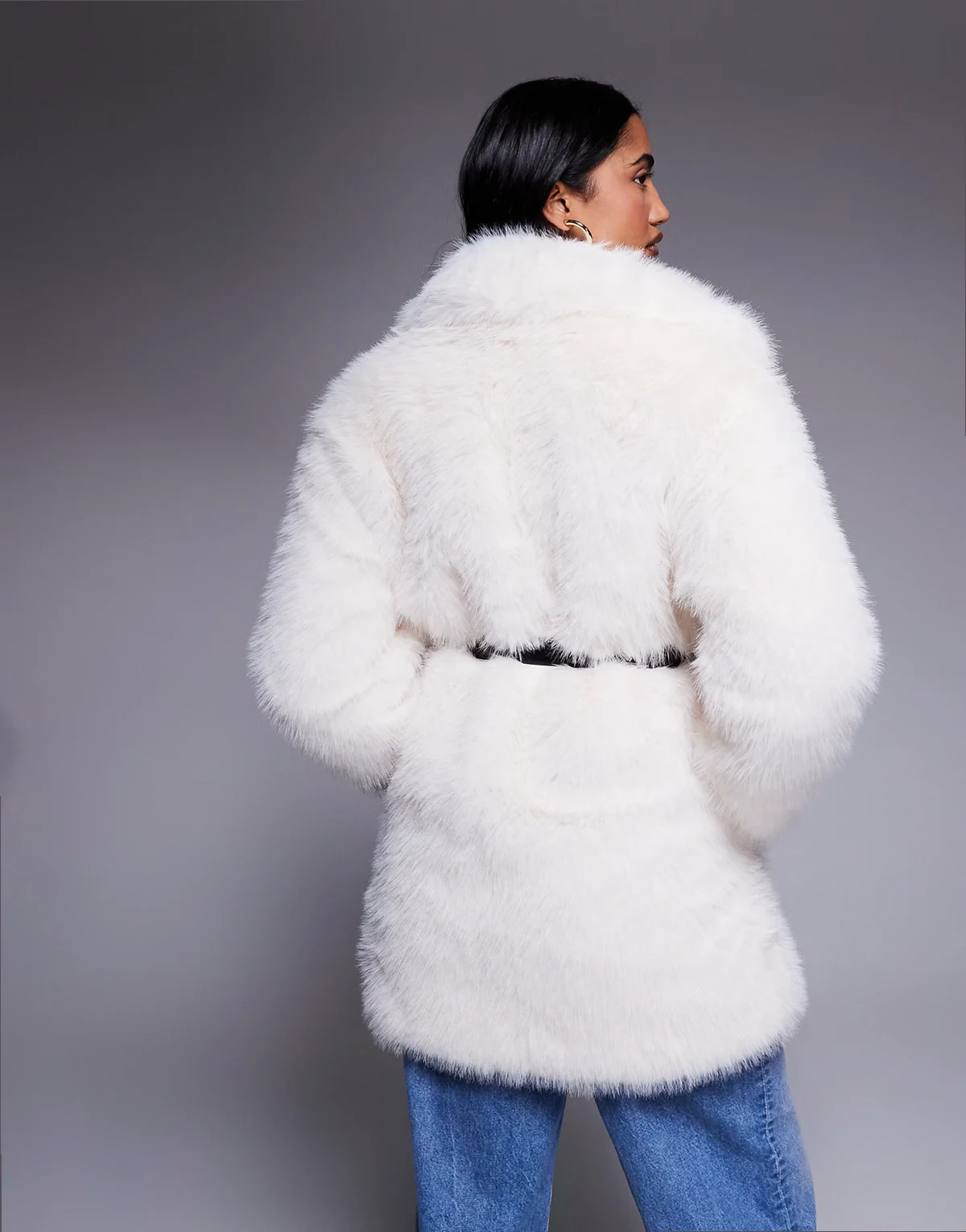 – Mittellanger Mantel aus Kunstpelz in Cremeweiß mit Gürtel