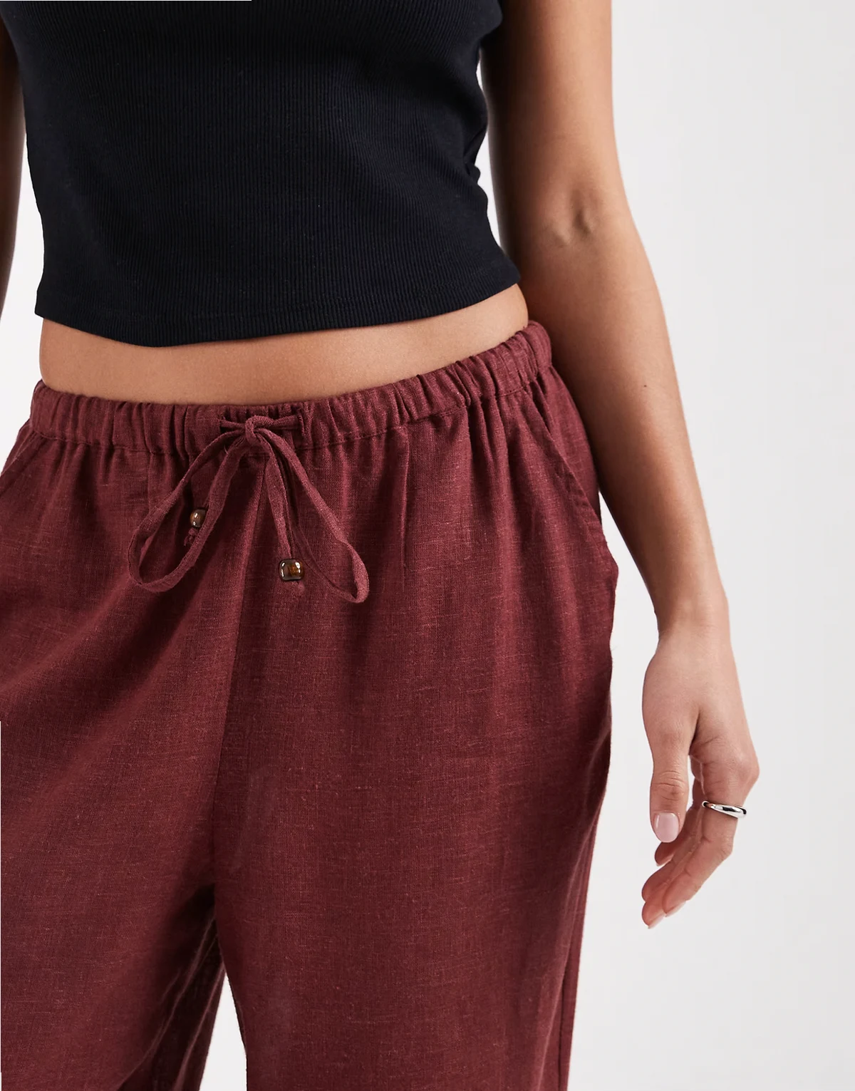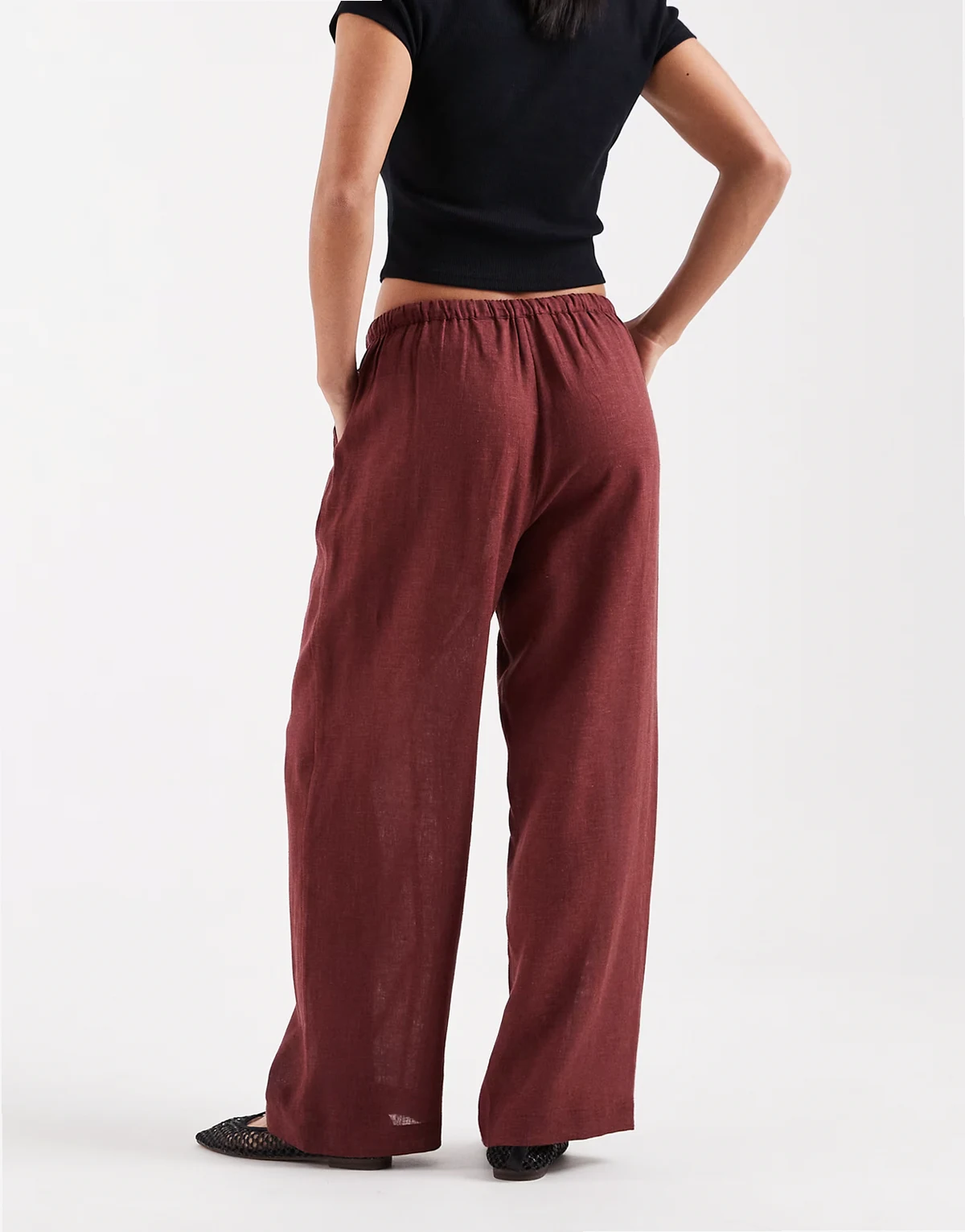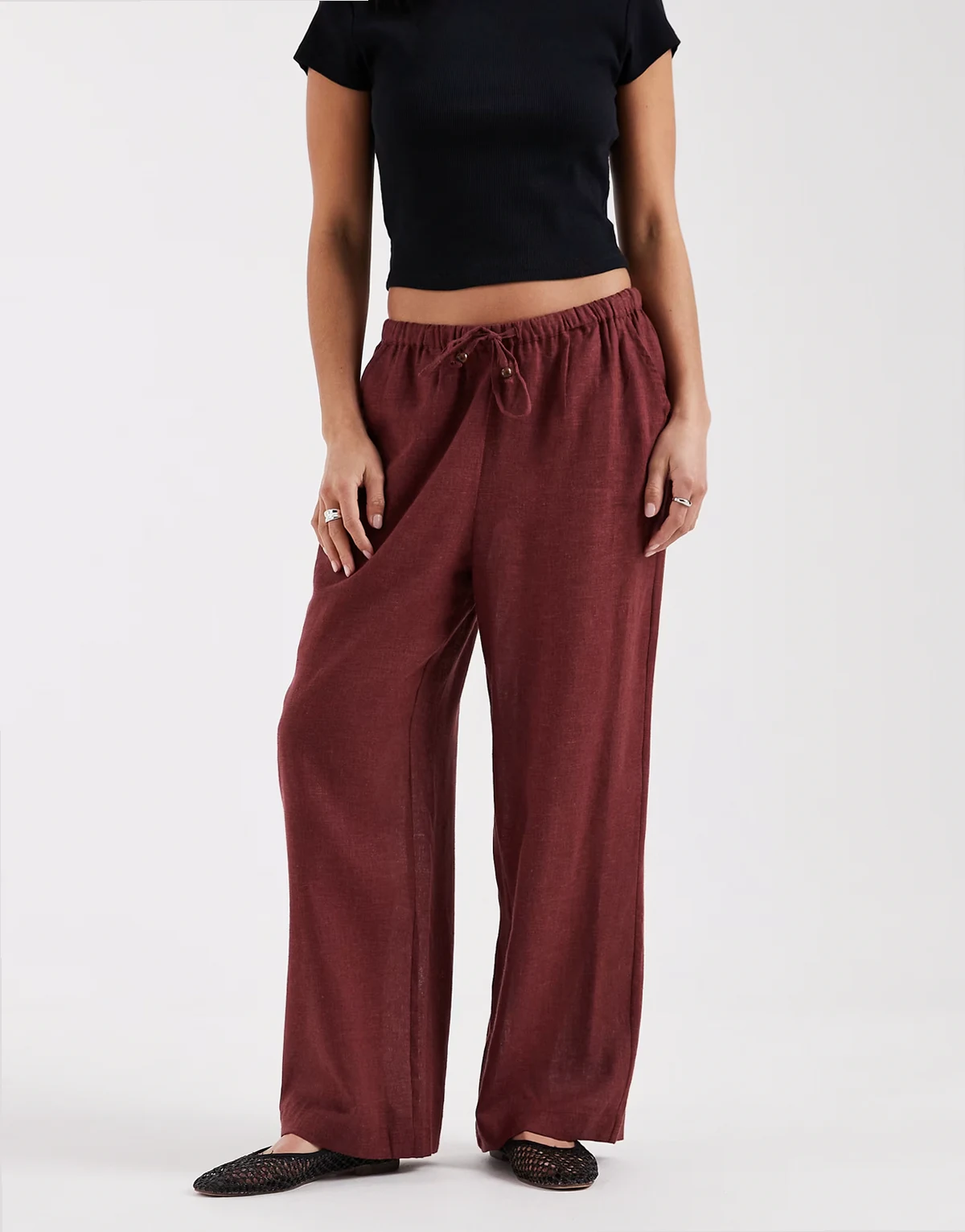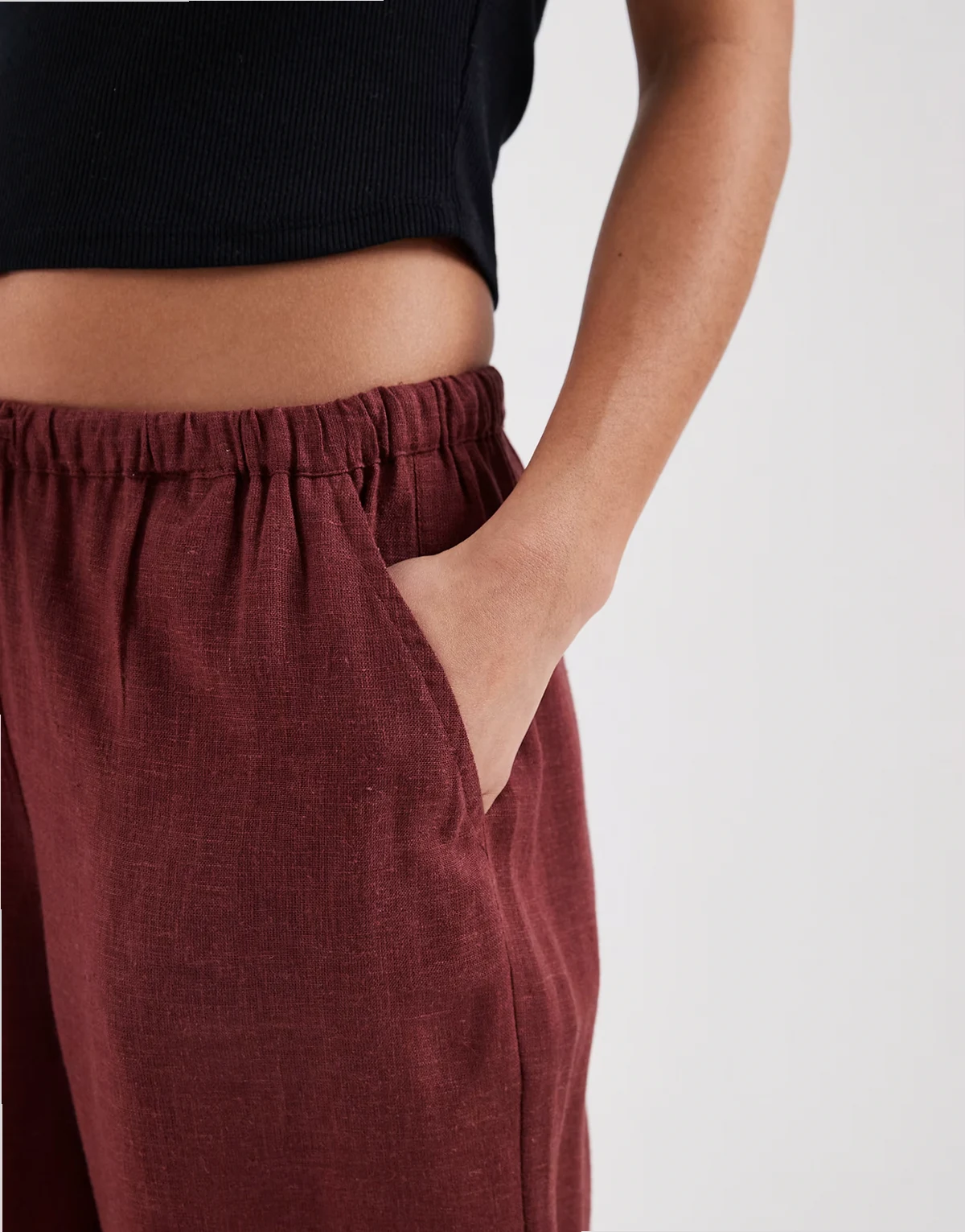 – Hose aus Leinenmix in Burgunderrot mit weitem Bein