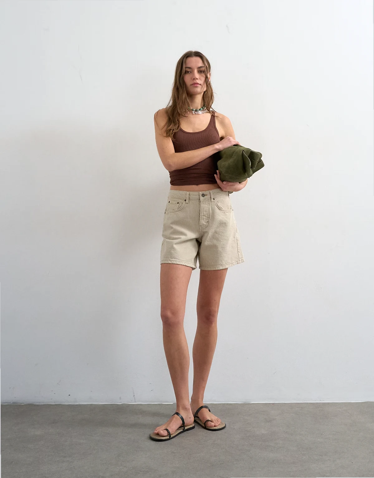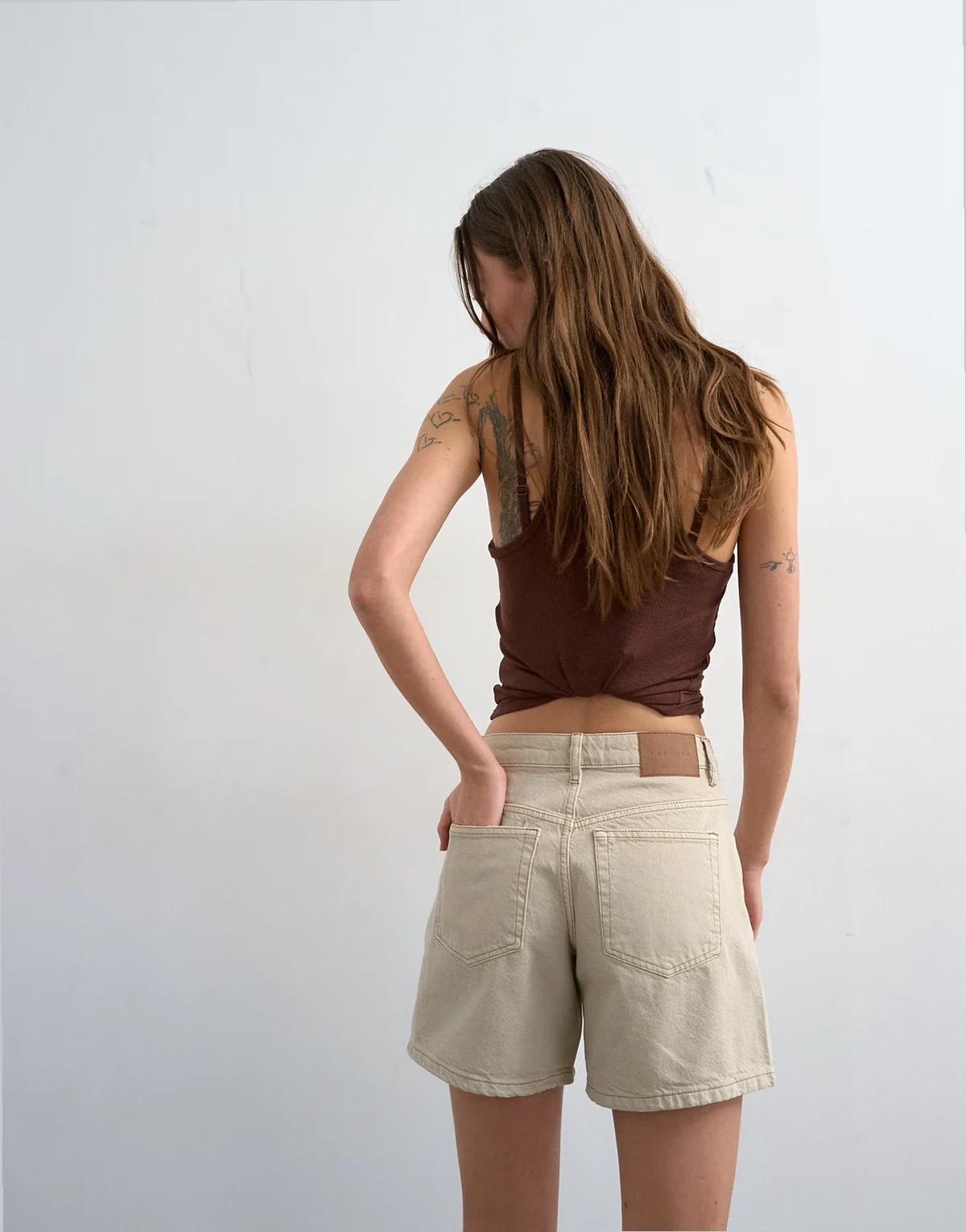 Diese Shorts sind aus Denim ohne Stretch in hellblauer Waschung gefertigt. Sie haben einen hohen Bund, Gürtelschlaufen, funktionale Taschen und einen Markenaufnäher auf der Rückseite. Das Modell hat eine reguläre Passform.